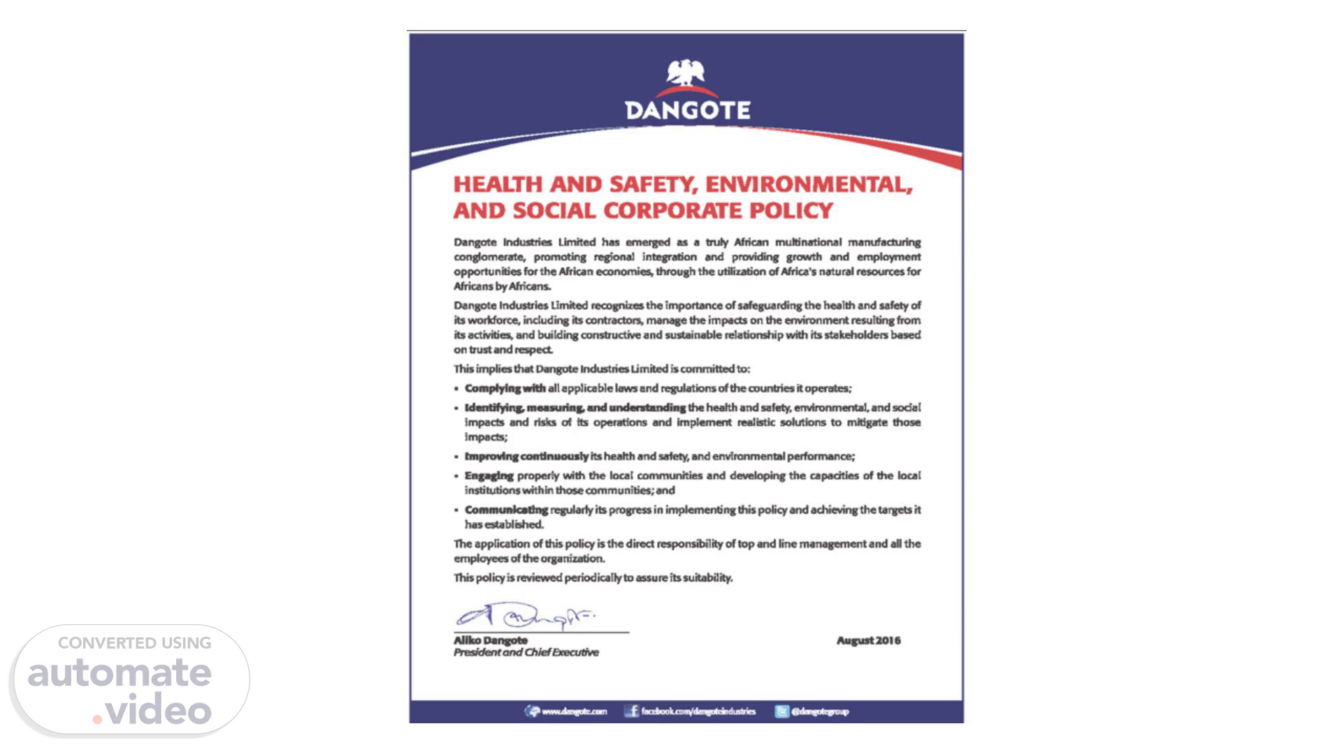 [image] DANGOTE HEALTH AND SAFETY, ENVIRONMENTAL, AND SOCIAL CORPORATE POLICY the the Danwte Indwüies the inwortance or sd.serding the and of workforce comractors man.e tie on eve from activiA and suGn•Ue iS on bust and • end • and • and the • iB prWeß in it has ntis is re iB.