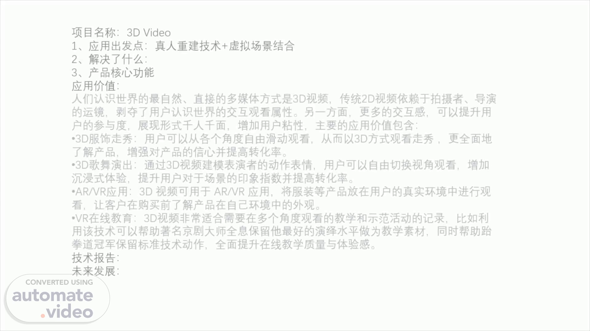 [Virtual Presenter] 项目名称:3D Video 1、应用出发点:真人重建技术+虚拟场景结合 2、解决了什么 3、产品核心功能.