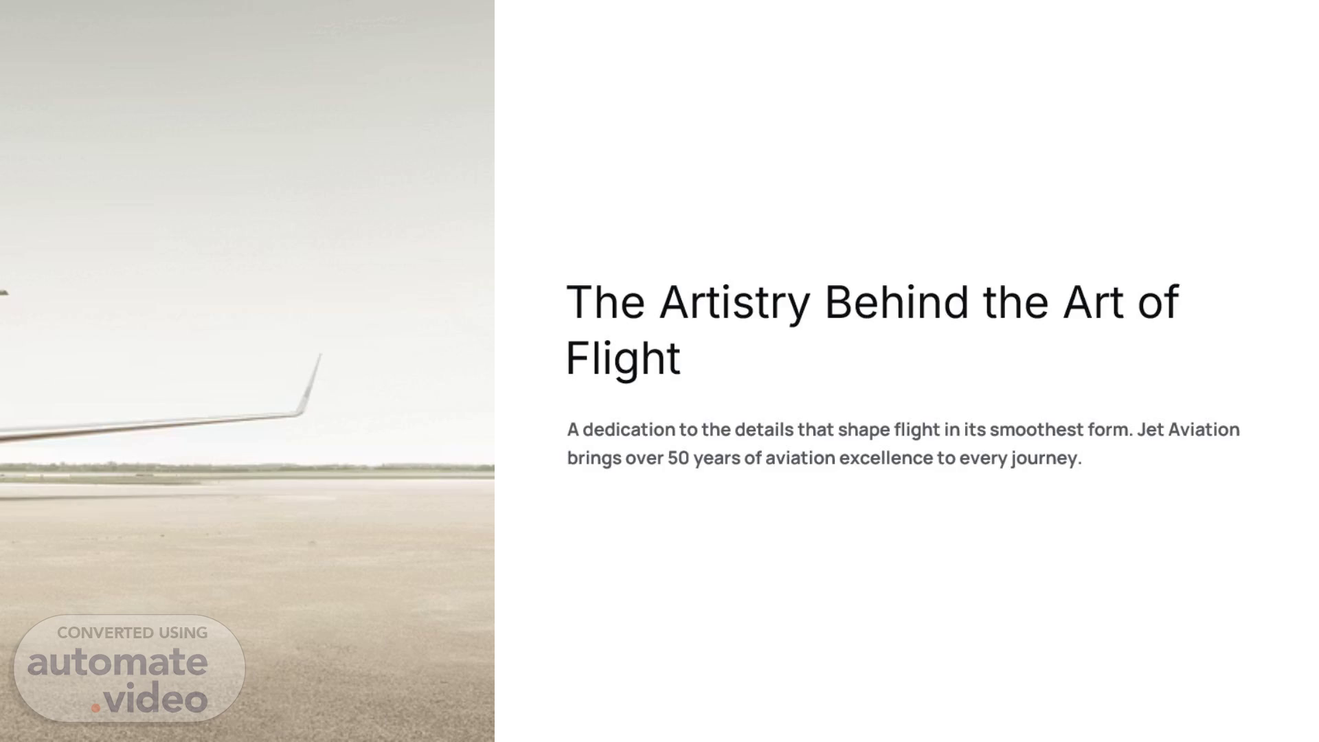 [Audio] Good morning, everyone. Today's presentation focuses on the artistry behind the art of flight. At Jet Aviation, every journey is shaped by attention to detail, precision, and over fifty years of aviation excellence..