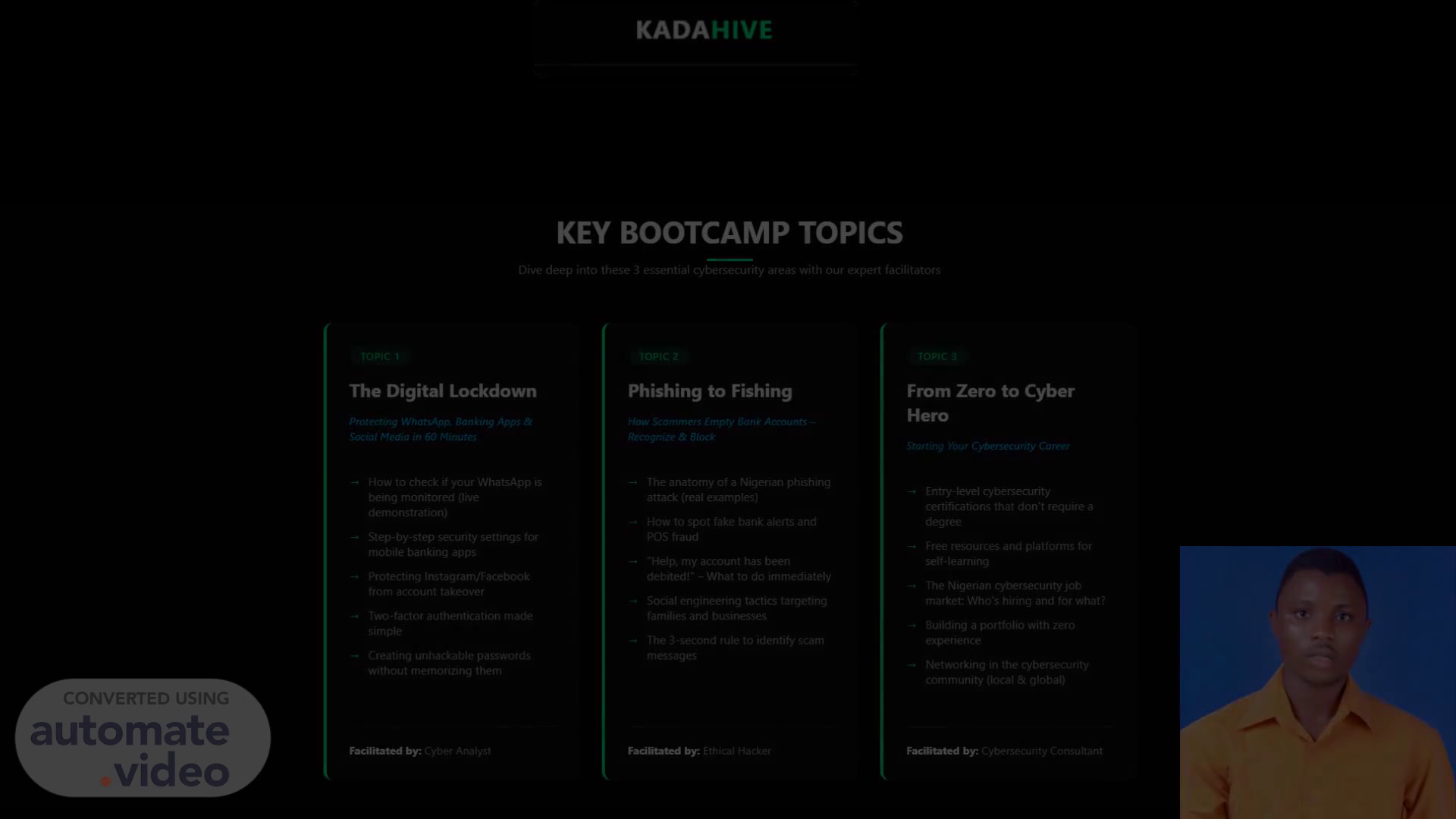 KEY BOOTCAMP TOPICS Dive deep into these 3 essential cybersecurity areas with our expert facilitators TOPIC 1 The Digital Lockdown Protecting WhatsApp, Banking Apps & Social Media in 60 Minutes How to check if your WhatsApp is being monitored (live demonstration) Step-by-step security settings for mobile banking apps -4 protecting Instagram/Facebook from account takeover Two-factor authentication made simple Creating unhackable passwords without memorizing them Facilitated by: Cyber Analyst TOPIC 2 Phishing to Fishing How Scammers Empty Bank Accounts Recognize & Block -4 The anatomy of a Nigerian phishing attack (real examples) How to spot fake bank alerts and pos fraud "Help, my account has been debited!" - What to do immediately Social engineering tactics targeting families and businesses The 3-second rule to identify scam messages FaöEtated by: Ethical Hacker TOPIC 3 From Zero to Cyber Hero Starting Your Cybersecurity Career Entry-level cybersecurity certifications that don't require a degree Free resources and platforms for self-learning The Nigerian cybersecurity job market: Who's hiring and for what? Building a portfolio with zero experience Networking in the cybersecurity community (local & global) by Cybersecurity Consultant.