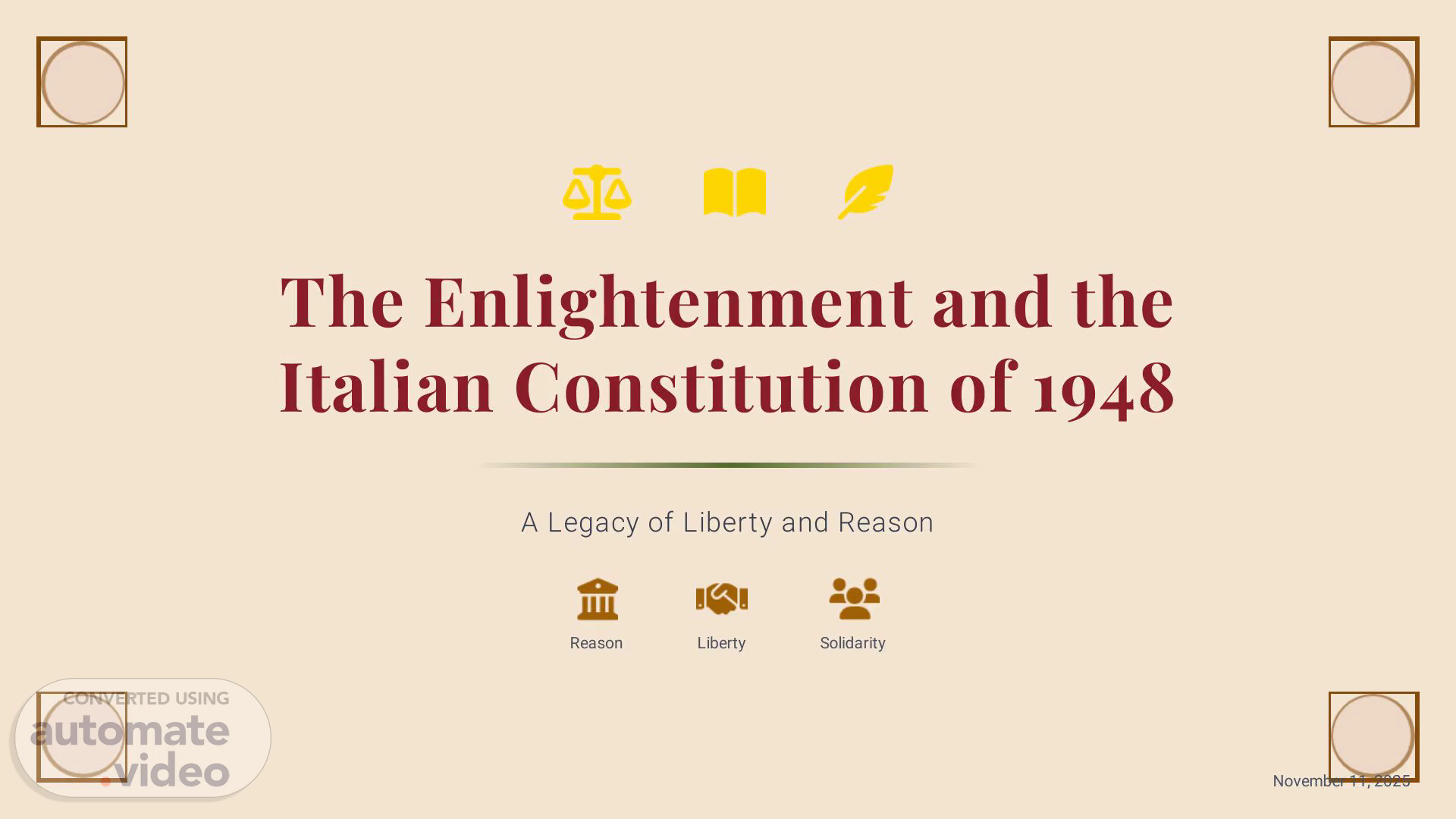 [Audio] Today we will be discussing The Enlightenment and its impact on the Italian Constitution of 1948. This period, spanning the 17th and 18th centuries in Europe, brought forth ideals of liberty, reason, and solidarity. These ideals still inspire us today, on November 11, 2025. The Enlightenment, also known as the Age of Reason, was a revolutionary movement that prioritized critical thinking and empirical evidence over superstition and blind faith. This shift in thinking led individuals to question traditional authority and embrace reason as the foundation of knowledge. Enlightenment thinkers applied the scientific method to societal problems, advocating for individual liberty, religious tolerance, and progress. Their emphasis on rational thought and evidence-based reasoning challenged outdated beliefs and influenced modern political and social thought. We recognize key figures of the Enlightenment, such as Voltaire, Rousseau, and Montesquieu, for their contributions to the movement. They advocated for a society based on reason, personal freedom, and the separation of powers in government. Considering the enduring impact of the Enlightenment, let us now continue our journey through this presentation with an open and enlightened mind..