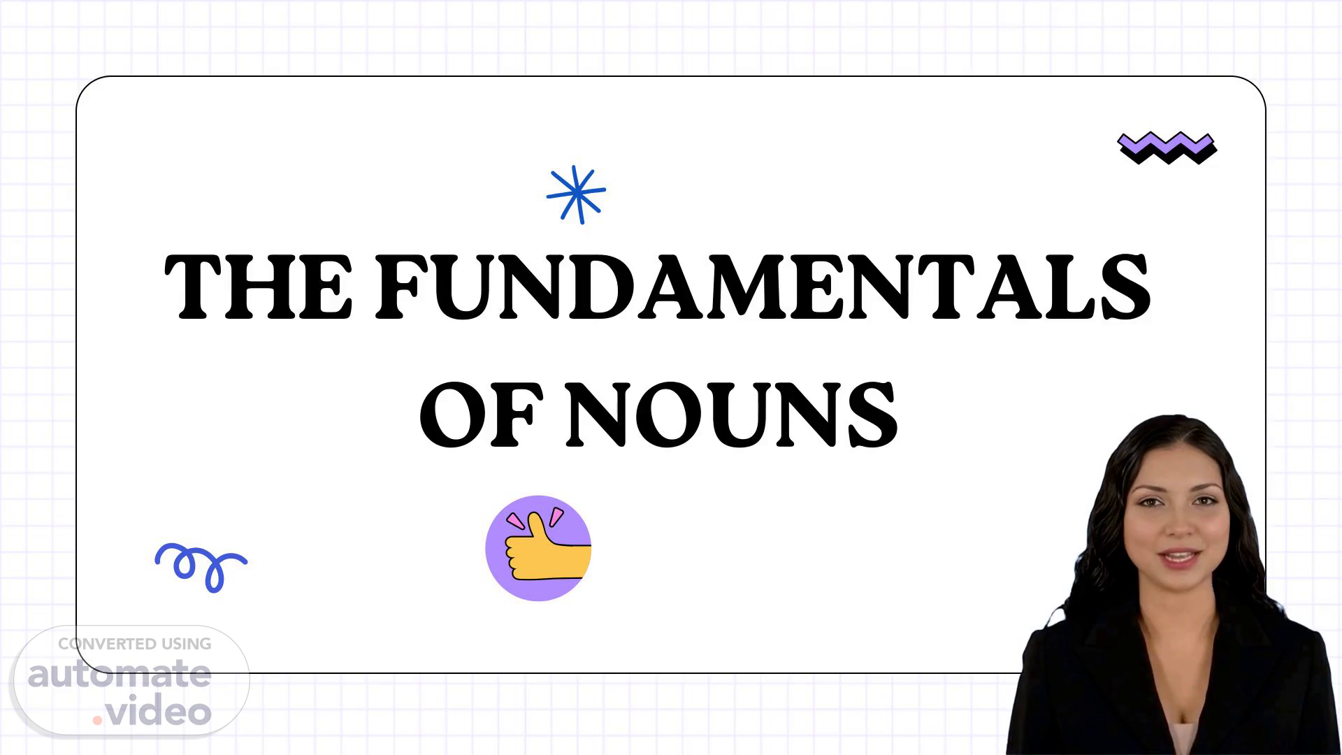 [Virtual Presenter] Nouns are words that refer to people, places, things, and ideas. They can be concrete objects such as books, cars, and trees, or concepts like happiness, freedom, and love. Nouns can also be proper nouns, which are names of specific individuals, organizations, or locations. Proper nouns have unique characteristics that distinguish them from common nouns. For example, "John Smith" is a proper noun because it refers to a specific person, whereas "city" is a common noun because it refers to any city, regardless of its name. Proper nouns often require special formatting when used in writing, such as title case or all caps. This helps to clearly identify them as distinct entities..