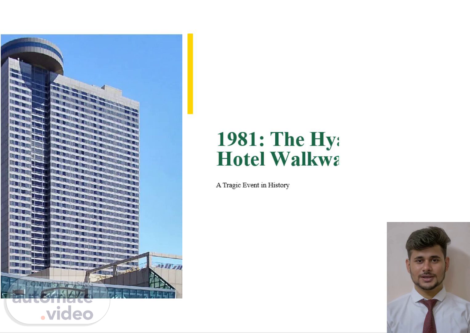 [Audio] We will discuss the tragic event that took place on July 17, 1981, at the Hyatt Regency Hotel in Kansas City. A walkway collapsed during a dance event, leading to the collapse of the entire structure. The disaster emphasizes the importance of safety and regulatory compliance in building design and construction..
