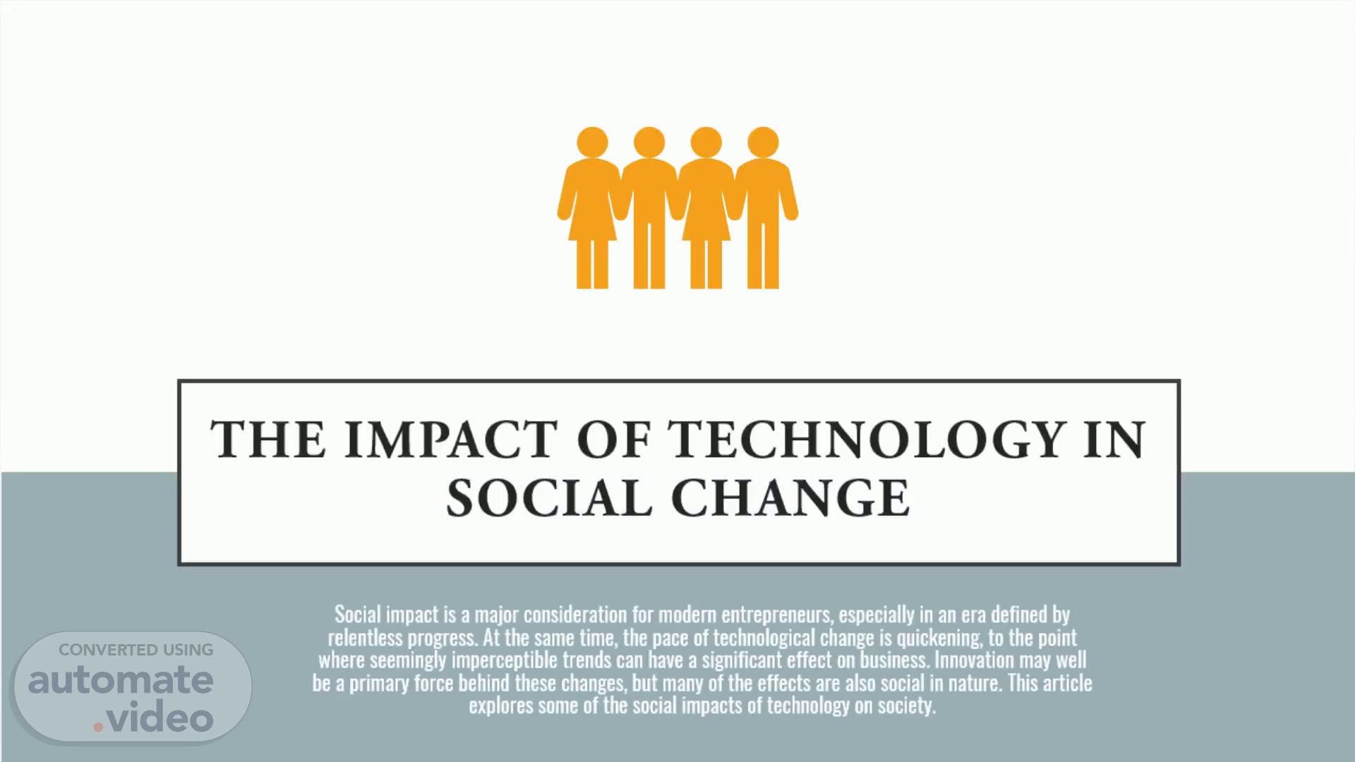 Group. Social impact is a major consideration for modern entrepreneurs, especially in an era defined by relentless progress. At the same time, the pace of technological change is quickening, to the point where seemingly imperceptible trends can have a significant effect on business. Innovation may well be a primary force behind these changes, but many of the effects are also social in nature. This article explores some of the social impacts of technology on society..
