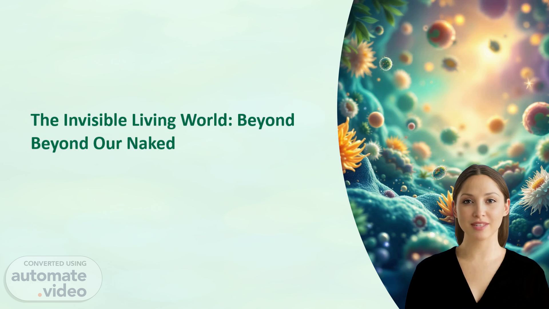 [Virtual Presenter] The invisible living world refers to the vast array of microorganisms that exist on every surface of the Earth, including rocks, soil, water, and air. These tiny creatures play a crucial role in shaping the environment and influencing human health. Microscopic organisms such as bacteria, archaea, fungi, and protozoa are found in almost every habitat, from the freezing cold Antarctic ice caps to the hottest deserts. They form symbiotic relationships with other organisms, contributing to nutrient cycling, decomposition, and the breakdown of organic matter..