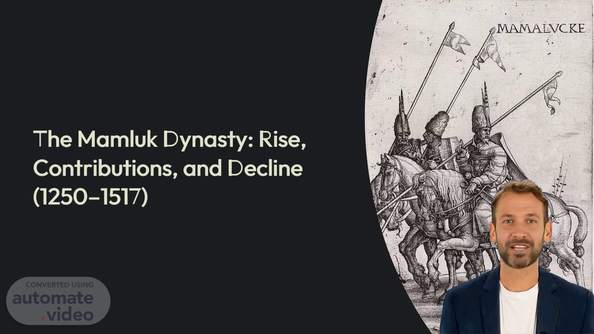 [Virtual Presenter] The Mamluk Sultanate was a powerful and influential empire that existed from the 13th to the 16th century in Egypt and Syria. The Mamluks were a group of slave-soldiers who rose to power through their military prowess and strategic alliances. They established a strong and centralized government, with a clear hierarchy and system of laws. The Mamluks also developed a sophisticated system of administration, which included a network of officials and administrators responsible for collecting taxes, maintaining law and order, and overseeing the economy. This system allowed them to maintain control over their vast territories and ensure the stability of their empire. The Mamluks were known for their military strength and bravery, as well as their administrative skills. They played a crucial role in defending Egypt against foreign invaders, including the Mongols and the Crusaders. The Mamluks also made significant contributions to the arts and culture, producing some of the most famous works of Islamic art and architecture. Their capital city, Cairo, became a center of learning and intellectual inquiry, attracting scholars and intellectuals from all over the world. Despite their many achievements, the Mamluk Sultanate began to decline in the 15th century due to internal conflicts and external pressures. The sultanate faced challenges from neighboring kingdoms and empires, including the Ottoman Empire, which eventually conquered Egypt in 1517. However, the Mamluks left behind a lasting legacy, shaping the course of history in the region and influencing the development of subsequent empires. The Mamluk Dynasty continued to exist until the 16th century, when it was finally dissolved by the Ottoman Empire. The legacy of the Mamluks can still be seen today, in the many architectural and artistic treasures they left behind. Theirs was a remarkable story of transformation and resilience, one that continues to captivate historians and scholars around the world..