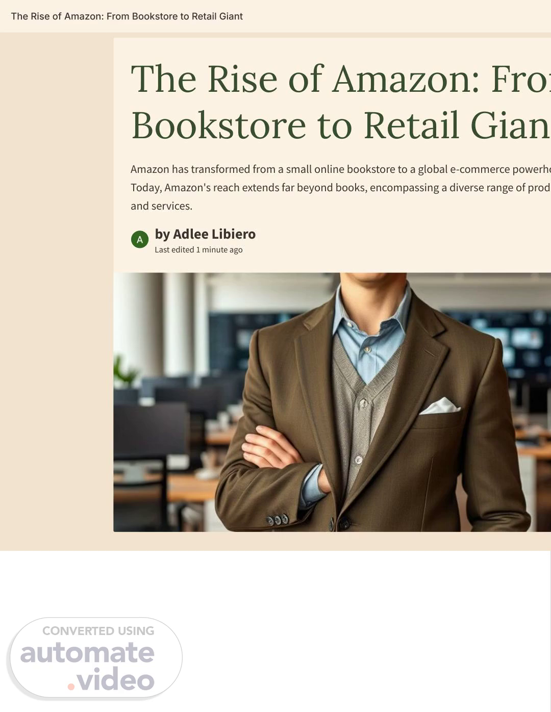 [Audio] The Rise of Amazon: From Bookstore to Retail Gian Amazon has transformed from a small online bookstore to a global e-commerce powerho Today, Amazon's reach extends far beyond books, encompassing a diverse range of prod and services. by Adlee Libiero Last edited 1 minute ago.