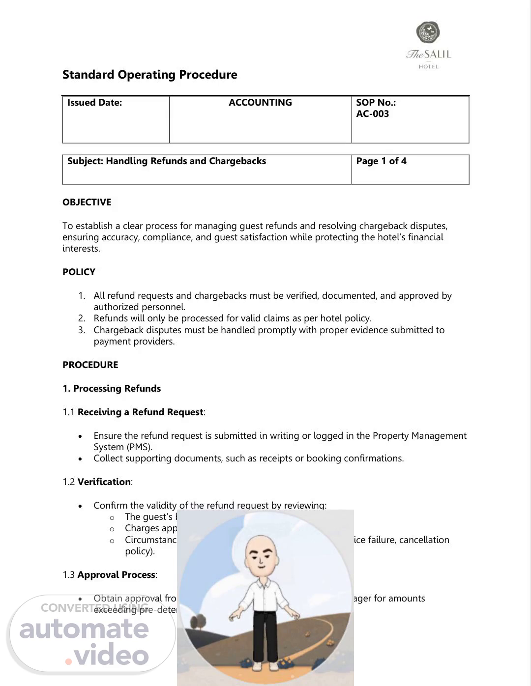 Standard Operating Procedure Issued Date: ACCOUNTING SOP No.: AC-003 Subject: Handling Refunds and Chargebacks Page 1 of 4 OBJECTIVE To establish a clear process for managing guest refunds and resolving chargeback disputes, ensuring accuracy, compliance, and guest satisfaction while protecting the hotel’s financial interests. POLICY 1. All refund requests and chargebacks must be verified, documented, and approved by authorized personnel. 2. Refunds will only be processed for valid claims as per hotel policy. 3. Chargeback disputes must be handled promptly with proper evidence submitted to payment providers. PROCEDURE 1. Processing Refunds 1.1 Receiving a Refund Request: • Ensure the refund request is submitted in writing or logged in the Property Management System (PMS). • Collect supporting documents, such as receipts or booking confirmations. 1.2 Verification: • Confirm the validity of the refund request by reviewing: o The guest’s booking details. o Charges applied to their account. o Circumstances leading to the refund request (e.g., service failure, cancellation policy). 1.3 Approval Process: • Obtain approval from the Financial Controller or General Manager for amounts exceeding pre-determined thresholds..