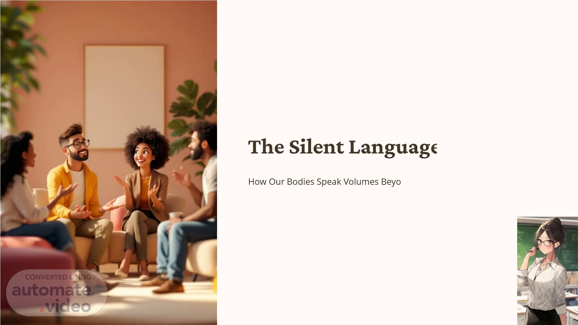 [Audio] Body language plays a significant role in our daily interactions. Every movement, expression, and gesture conveys meaning. This includes hand movements such as gestures, which can emphasize, direct, or express emotions during conversations. Our posture also conveys information about us, revealing whether we are confident, open, or defensive. Eye contact is essential, as it shows engagement, trust, or sometimes challenge. Non-verbal cues are crucial in understanding each other's intentions and feelings. Being aware of these cues helps us navigate social situations more effectively and builds stronger relationships..