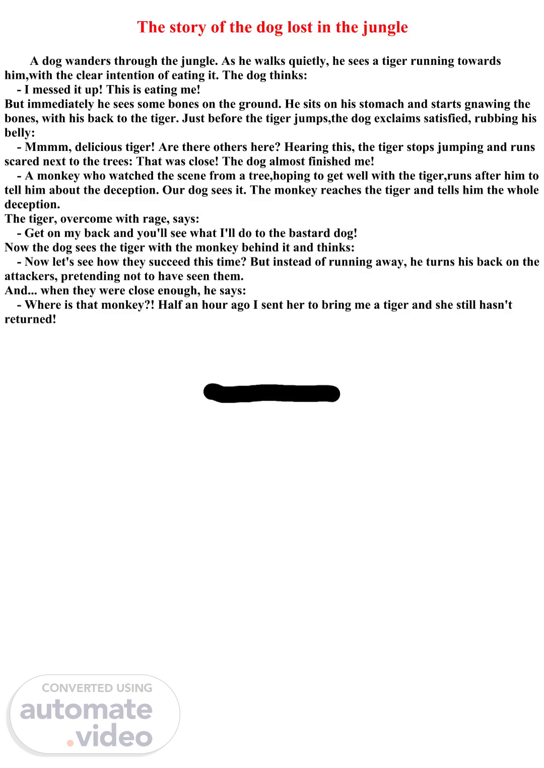 . The story of the dog lost in the jungle A dog wanders through the jungle. As he walks quietly, he sees a tiger running towards him,with the clear intention of eating it. The dog thinks: - I messed it up! This is eating me! But immediately he sees some bones on the ground. He sits on his stomach and starts gnawing the bones, with his back to the tiger. Just before the tiger jumps,the dog exclaims satisfied, rubbing his belly: - Mmmm, delicious tiger! Are there others here? Hearing this, the tiger stops jumping and runs scared next to the trees: That was close! The dog almost finished me! - A monkey who watched the scene from a tree,hoping to get well with the tiger,runs after him to tell him about the deception. Our dog sees it. The monkey reaches the tiger and tells him the whole deception. The tiger, overcome with rage, says: - Get on my back and you'll see what I'll do to the bastard dog! Now the dog sees the tiger with the monkey behind it and thinks: - Now let's see how they succeed this time? But instead of running away, he turns his back on the attackers, pretending not to have seen them. And... when they were close enough, he says: - Where is that monkey?! Half an hour ago I sent her to bring me a tiger and she still hasn't returned!.