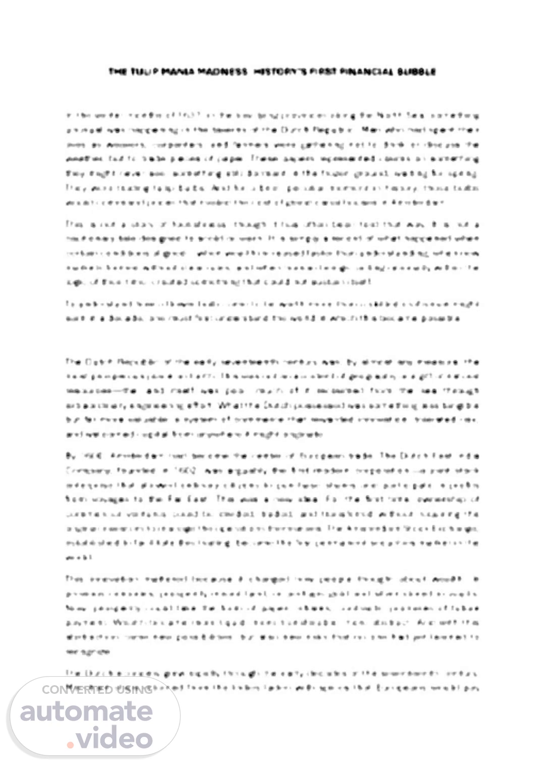 [Audio] The speaker describes the contrast between the everyday lives of ordinary people and those involved in the tulip trade. The ordinary people continue to live normal lives, unaffected by the speculative fervor surrounding the tulip bulbs. In contrast, the individuals involved in the tulip trade are driven by an insatiable desire for profit and security. They are consumed by the prospect of making a large sum of money from the sale of these bulbs. The speaker notes that despite their intense focus on the market, the tulip bulbs themselves remain completely indifferent to the fluctuations in price. This indifference is a stark reminder that the true value of the tulip bulbs lies not in their intrinsic worth, but in the psychological need they fulfill for some individuals. The speaker suggests that the tulip trade was not about the flowers themselves, but rather about the human psyche and the desire for financial security and prosperity. The speaker leaves the listener with a sense of detachment and ambiguity, implying that the events that unfolded were unique and perhaps unexplainable. The nature of such events remains a mystery, and this is a truth that will likely continue to elude us..
