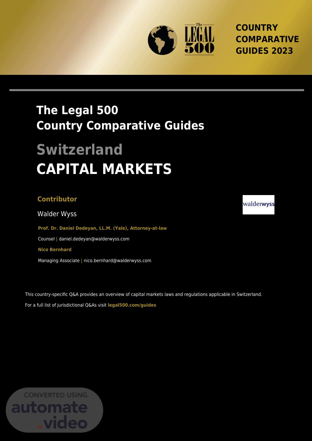 COUNTRY COMPARATIVE GUIDES 2023 The Legal 500 Country Comparative Guides Switzerland CAPITAL MARKETS Contributor Walder Wyss Walder Wyss Prof. Dr. Daniel Dedeyan, LL.M. (Yale), Attorney-at-law Counsel | [email protected] Nico Bernhard Managing Associate | [email protected] This country-specific Q&A provides an overview of capital markets laws and regulations applicable in Switzerland. For a full list of jurisdictional Q&As visit legal500.com/guides.