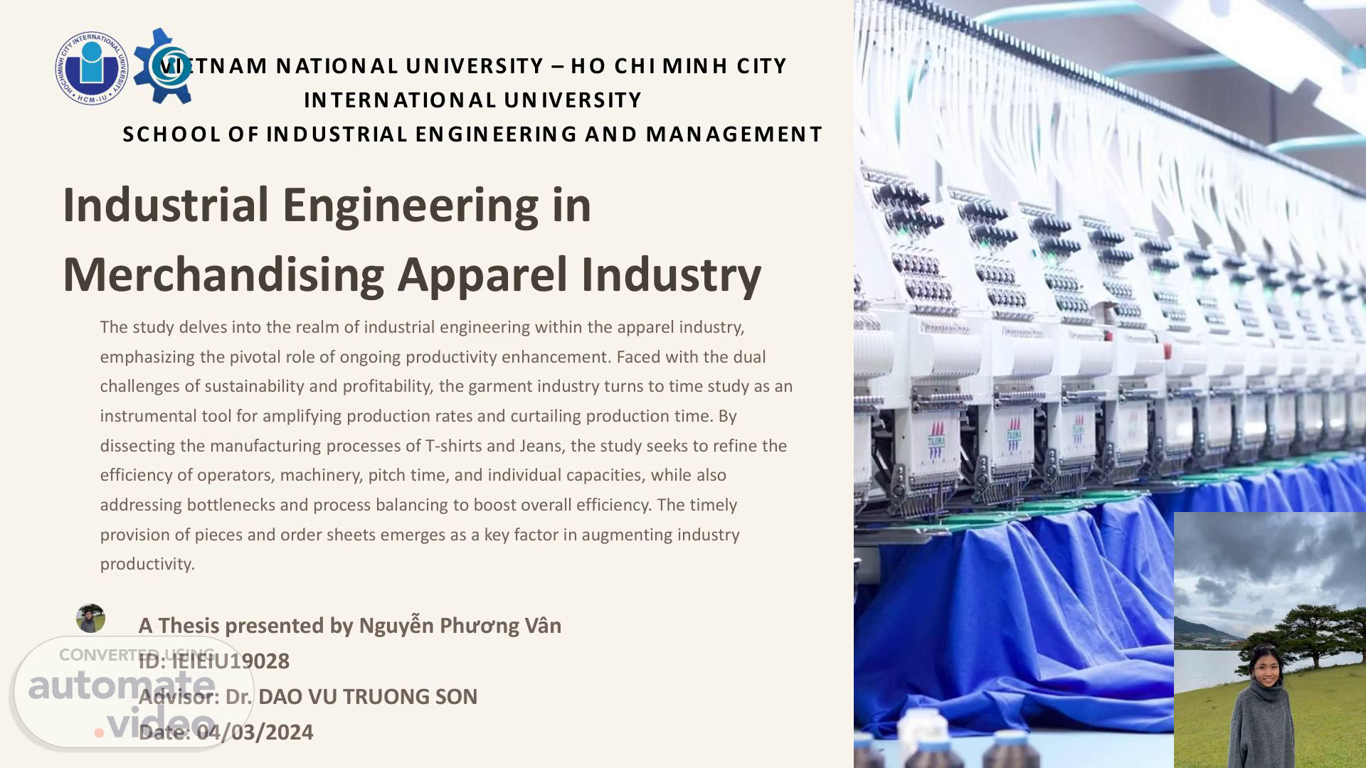 undefined. VIETN AM N ATION AL UN IVERSITY – H O CH I MIN H CITY IN TERN ATION AL UN IVERSITY SCH OOL OF IN DUSTRIAL EN GIN EERIN G AN D MAN AGEMEN T Industrial Engineering in Merchandising Apparel Industry The study delves into the realm of industrial engineering within the apparel industry, emphasizing the pivotal role of ongoing productivity enhancement. Faced with the dual challenges of sustainability and profitability, the garment industry turns to time study as an instrumental tool for amplifying production rates and curtailing production time. By dissecting the manufacturing processes of T-shirts and Jeans, the study seeks to refine the efficiency of operators, machinery, pitch time, and individual capacities, while also addressing bottlenecks and process balancing to boost overall efficiency. The timely provision of pieces and order sheets emerges as a key factor in augmenting industry productivity. A Thesis presented by Nguyễn Phương Vân ID: IEIEIU19028 Advisor: Dr. DAO VU TRUONG SON Date: 04/03/2024.