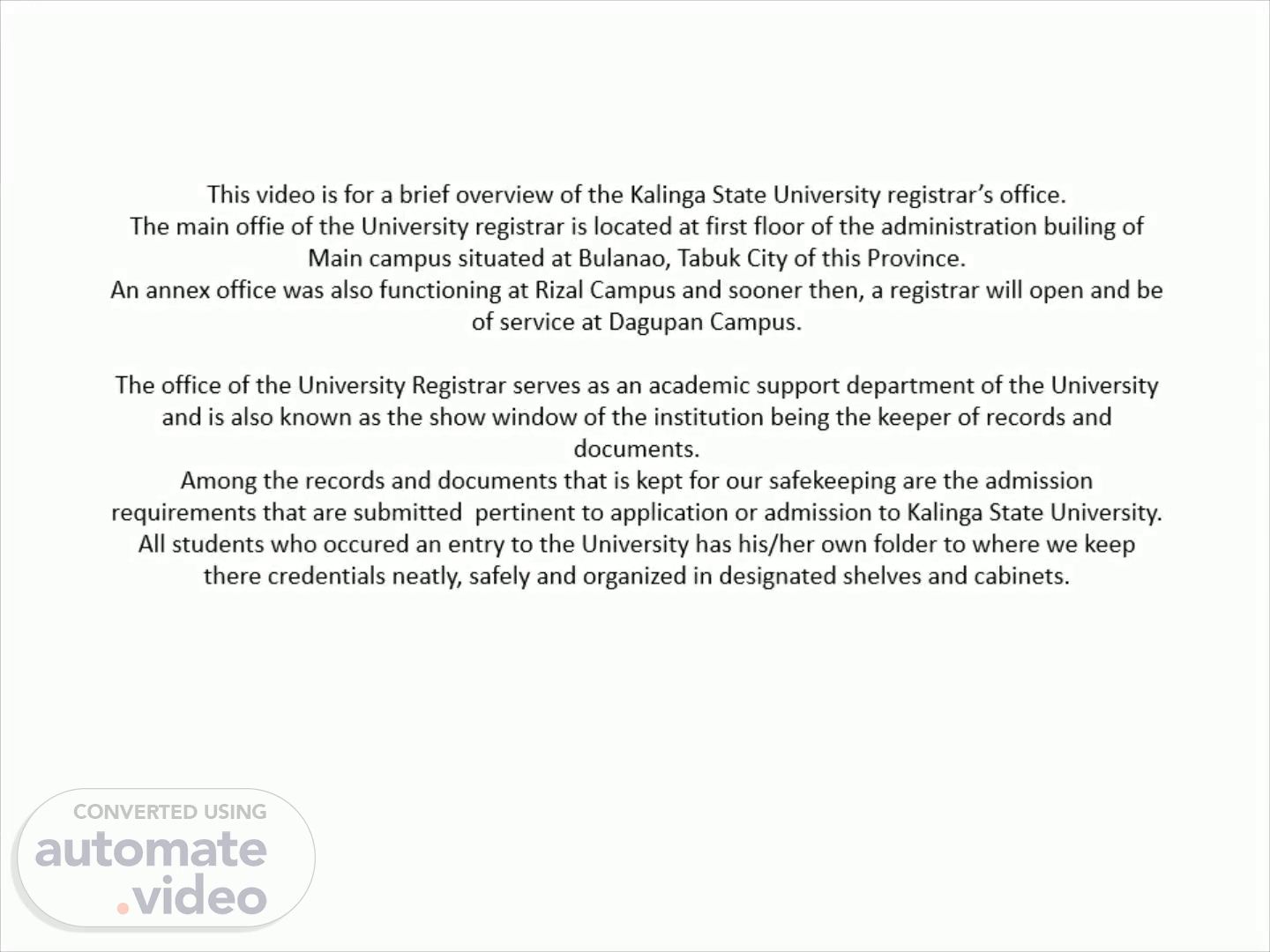 This video is for a brief overview of the Kalinga State University registrar’s office. The main offie of the University registrar is located at first floor of the administration builing of Main campus situated at Bulanao, Tabuk City of this Province. An annex office was also functioning at Rizal Campus and sooner then, a registrar will open and be of service at Dagupan Campus. The office of the University Registrar serves as an academic support department of the University and is also known as the show window of the institution being the keeper of records and documents. Among the records and documents that is kept for our safekeeping are the admission requirements that are submitted pertinent to application or admission to Kalinga State University. All students who occured an entry to the University has his/her own folder to where we keep there credentials neatly, safely and organized in designated shelves and cabinets..