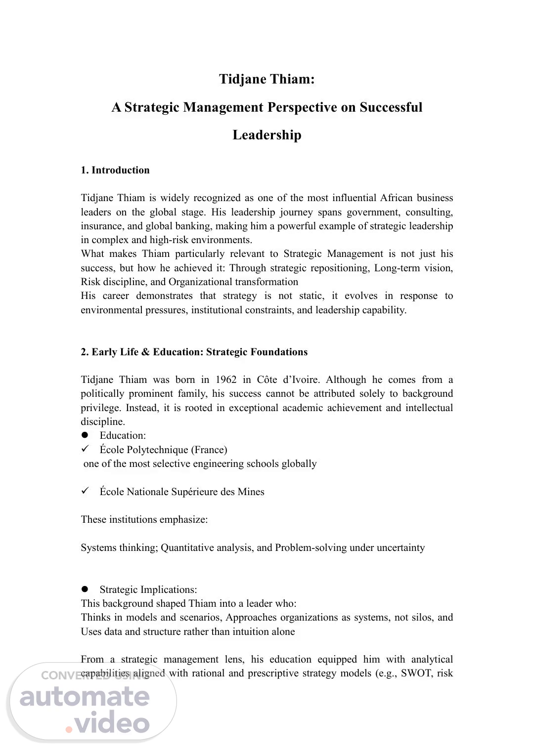 [Virtual Presenter] Tidjane Thiam: A Strategic Management Perspective on Successful Leadership 1. Introduction Tidjane Thiam is widely recognized as one of the most influential African business leaders on the global stage. His leadership journey spans government, consulting, insurance, and global banking, making him a powerful example of strategic leadership in complex and high-risk environments. What makes Thiam particularly relevant to Strategic Management is not just his success, but how he achieved it: Through strategic repositioning, Long-term vision, Risk discipline, and Organizational transformation His career demonstrates that strategy is not static, it evolves in response to environmental pressures, institutional constraints, and leadership capability. 2. Early Life & Education: Strategic Foundations Tidjane Thiam was born in 1962 in Côte d’Ivoire. Although he comes from a politically prominent family, his success cannot be attributed solely to background privilege. Instead, it is rooted in exceptional academic achievement and intellectual discipline. Education: École Polytechnique (France) one of the most selective engineering schools globally École Nationale Supérieure des Mines These institutions emphasize: Systems thinking; Quantitative analysis, and Problem-solving under uncertainty Strategic Implications: This background shaped Thiam into a leader who: Thinks in models and scenarios, Approaches organizations as systems, not silos, and Uses data and structure rather than intuition alone From a strategic management lens, his education equipped him with analytical capabilities aligned with rational and prescriptive strategy models (e.g., SWOT, risk.
