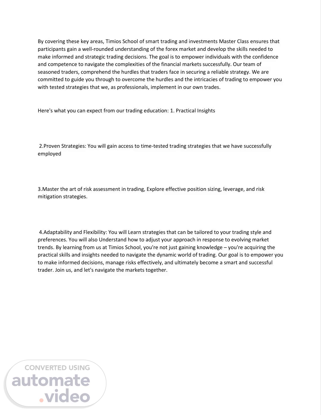 By covering these key areas, Timios School of smart trading and investments Master Class ensures that participants gain a well-rounded understanding of the forex market and develop the skills needed to make informed and strategic trading decisions. The goal is to empower individuals with the confidence and competence to navigate the complexities of the financial markets successfully. Our team of seasoned traders, comprehend the hurdles that traders face in securing a reliable strategy. We are committed to guide you through to overcome the hurdles and the intricacies of trading to empower you with tested strategies that we, as professionals, implement in our own trades. Here's what you can expect from our trading education: 1. Practical Insights 2.Proven Strategies: You will gain access to time-tested trading strategies that we have successfully employed 3.Master the art of risk assessment in trading, Explore effective position sizing, leverage, and risk mitigation strategies. 4.Adaptability and Flexibility: You will Learn strategies that can be tailored to your trading style and preferences. You will also Understand how to adjust your approach in response to evolving market trends. By learning from us at Timios School, you're not just gaining knowledge – you're acquiring the practical skills and insights needed to navigate the dynamic world of trading. Our goal is to empower you to make informed decisions, manage risks effectively, and ultimately become a smart and successful trader. Join us, and let's navigate the markets together..