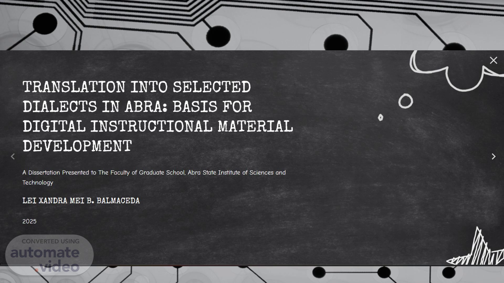 Title Layout. Subtitle. x Problem 1; Developing Digital Instructional Materials for Intercultural Language Enrichment In multicultural and multilingual societies like the Philippines, indigenous groups such as the Itneg people face significant barriers in education. Despite the Mother Tongue-Based Multilingual Education (MTB-MLE) policy, o gap exists in culturally and linguistically relevant digital instructional materials (DIMs). • This research addressed the gap by creating 10 digital video lessons for the Purposive Communication course. Lessons were translated into four Itneg dialects: Binongan, Mabaka, Maeng, and Masadiit. The goal was to enhance academic understanding and promote intercultural language enrichment by revitalizing the learners' linguistic heritage..
