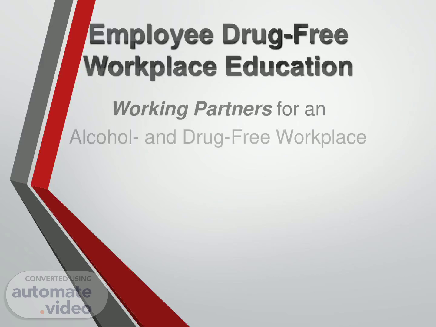 [Audio] Employee Education Outline Objectives of training Overview of Drug-Free Workplace Policy Impact of substance abuse in the workplace Ways that people use alcohol and other drugs Understanding addiction Signs and symptoms of substance abuse Family and coworker impact Assistance Confidentiality Specific drugs of abuse 2.