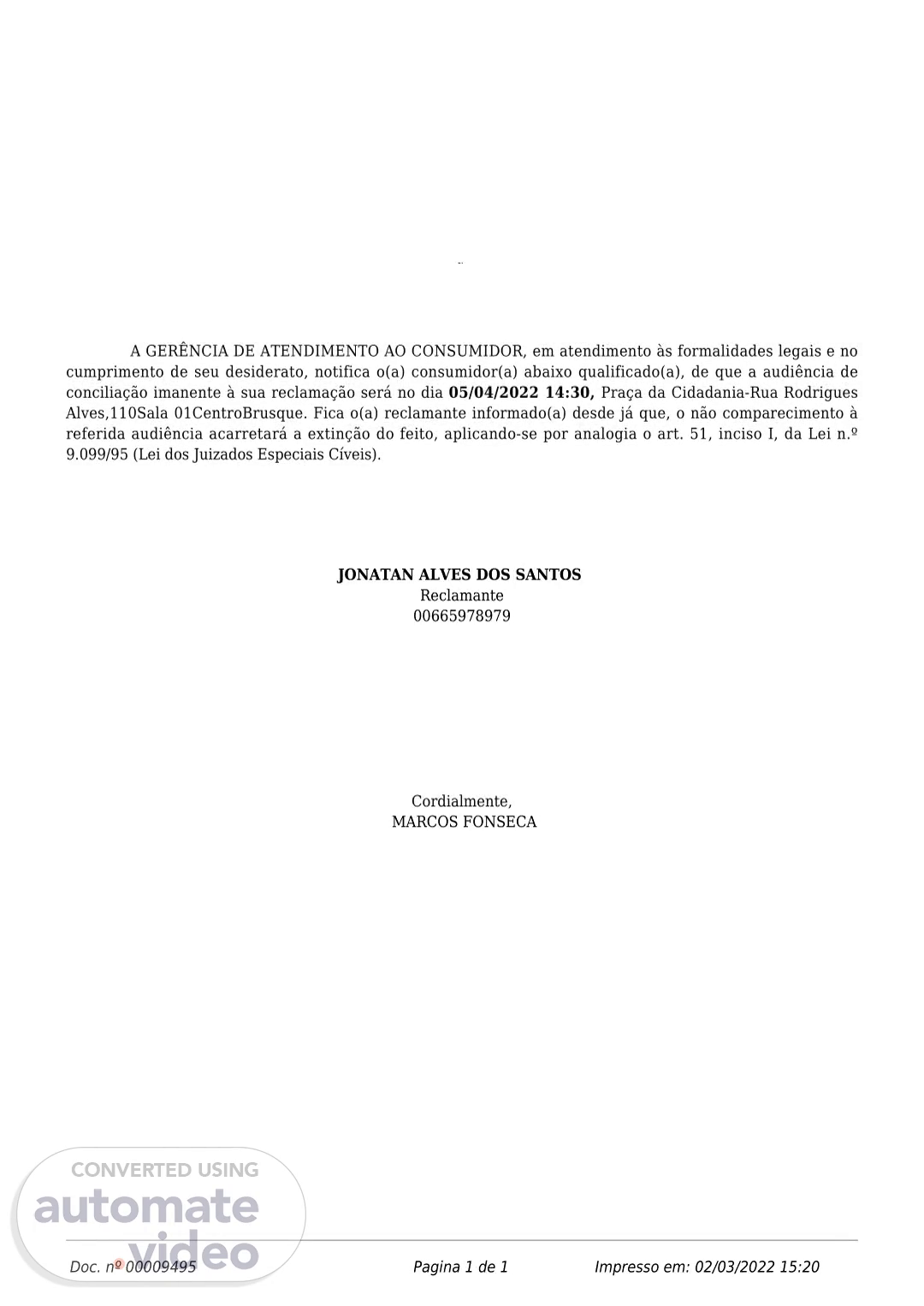 [Audio] Doc. nº 00009495 Pagina 1 de 1 Impresso em: 02/ 03/ 2022 15: 20 NOTIFICAÇÃO 00009495 FA 42. 032. 001. 22- 0000106 A GERÊNCIA DE ATENDIMENTO AO CONSUMIDOR, em atendimento às formalidades legais e no cumprimento de seu desiderato, notifica o(a) consumidor(a) abaixo qualificado(a), de que a audiência de conciliação imanente à sua reclamação será no dia 05/ 04/2022 14: 30, Praça da Cidadania- Rua Rodrigues Alves, 110Sala 01CentroBrusque. Fica o(a) reclamante informado(a) desde já que, o não comparecimento à referida audiência acarretará a extinção do feito, aplicando-se por analogia o art. 51, inciso I, da Lei n.º 9.099/ 95 ( Lei dos Juizados Especiais Cíveis). JONATAN ALVES DOS SANTOS Reclamante 00665978979 Cordialmente, MARCOS FONSECA.
