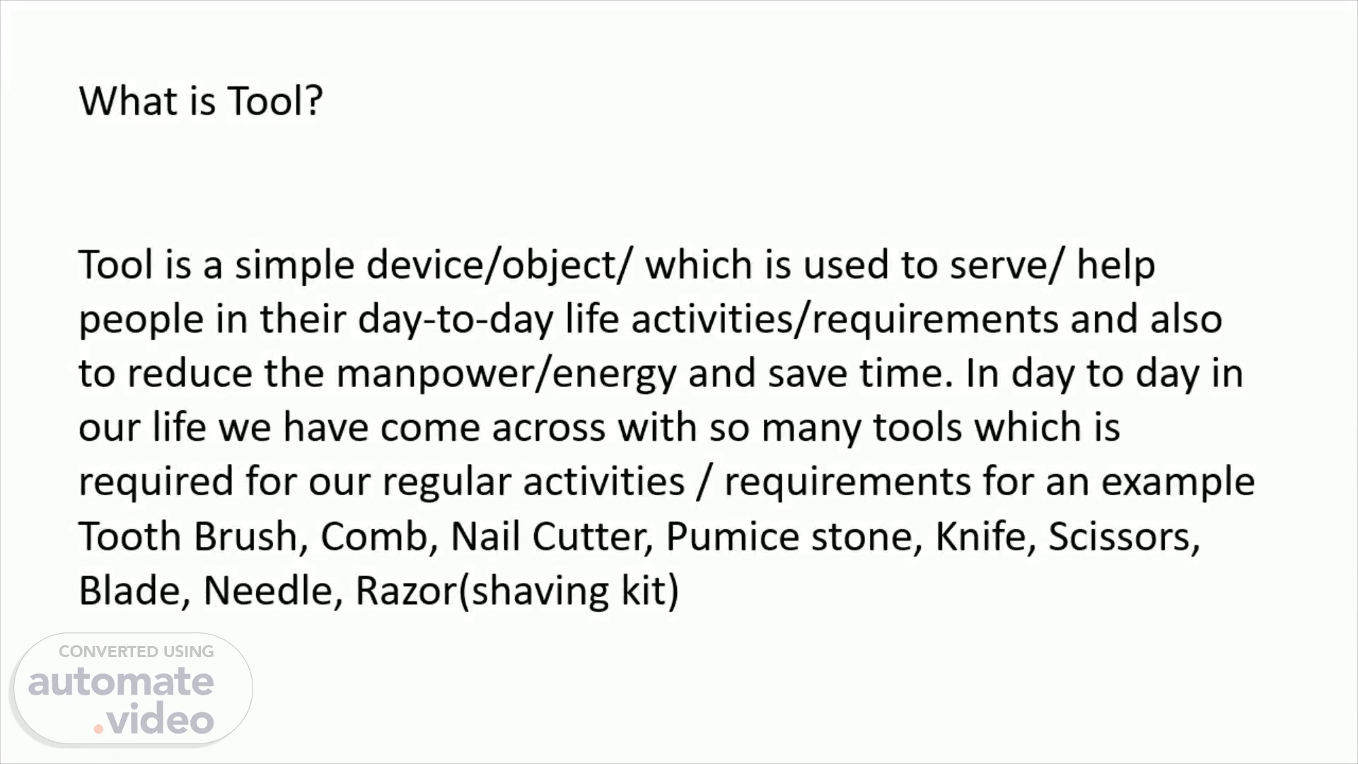 What is Tool? Tool is a simple device/object/ which is used to serve/ help people in their day-to-day life activities/requirements and also to reduce the manpower/energy and save time. In day to day in our life we have come across with so many tools which is required for our regular activities / requirements for an example Tooth Brush, Comb, Nail Cutter, Pumice stone, Knife, Scissors, Blade, Needle, Razor(shaving kit).