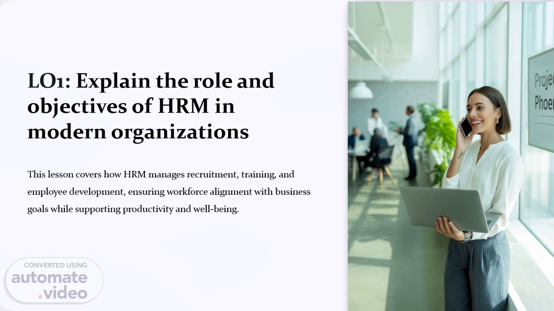 [Audio] Welcome everyone! Today, we are going to learn about the role and objectives of Human Resource Management, or HRM, in modern organizations. In this session, we will cover important topics like What is Human Resource Management?, Core HRM Functions, Strategic Objectives of Modern HRM, The Evolution of HRM, and so on. By the end of this class, you will have a clear understanding of how HR helps organizations grow and support their employees..