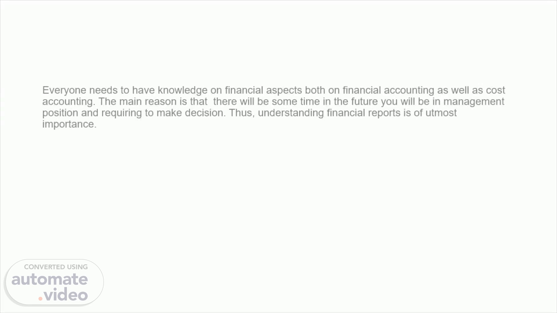 [Audio] Everyone needs to have knowledge on financial aspects both on financial accounting as well as cost accounting. The main reason is that there will be some time in the future you will be in management position and requiring to make decision. Thus, understanding financial reports is of utmost importance..
