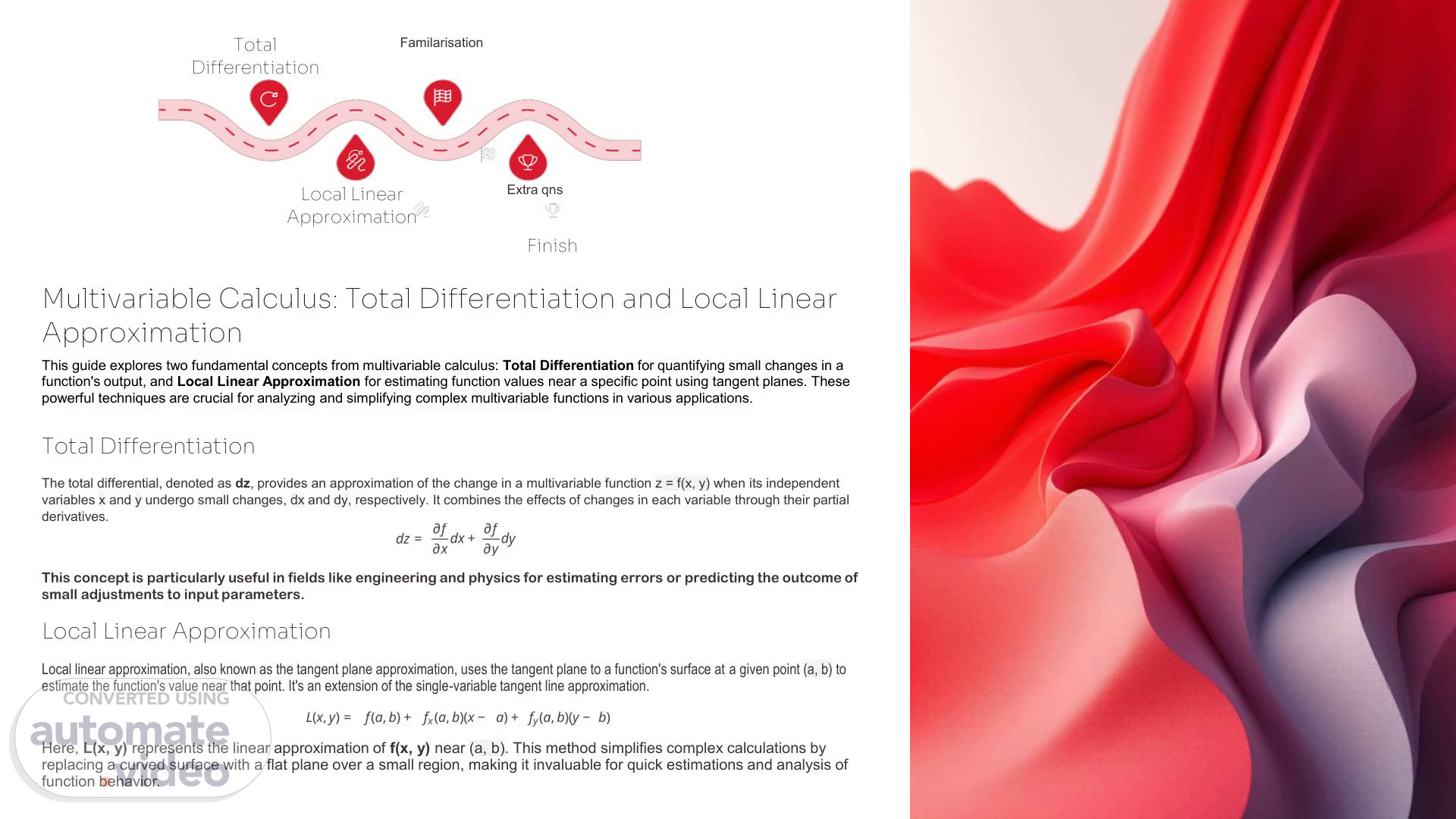 [Audio] Familarisation Total Differentiation Extra qns Local Linear Approximation Finish Multivariable Calculus: Total Differentiation and Local Linear Approximation This guide explores two fundamental concepts from multivariable calculus: Total Differentiation for quantifying small changes in a function's output, and Local Linear Approximation for estimating function values near a specific point using tangent planes. These powerful techniques are crucial for analyzing and simplifying complex multivariable functions in various applications. Total Differentiation The total differential, denoted as dz, provides an approximation of the change in a multivariable function z = f(x, y) when its independent variables x and y undergo small changes, dx and dy, respectively. It combines the effects of changes in each variable through their partial derivatives. This concept is particularly useful in fields like engineering and physics for estimating errors or predicting the outcome of small adjustments to input parameters. Local Linear Approximation Local linear approximation, also known as the tangent plane approximation, uses the tangent plane to a function's surface at a given point (a, b) to estimate the function's value near that point. It's an extension of the single-variable tangent line approximation. preencoded.png Here, L(x, y) represents the linear approximation of f(x, y) near (a, b). This method simplifies complex calculations by replacing a curved surface with a flat plane over a small region, making it invaluable for quick estimations and analysis of function behavior..