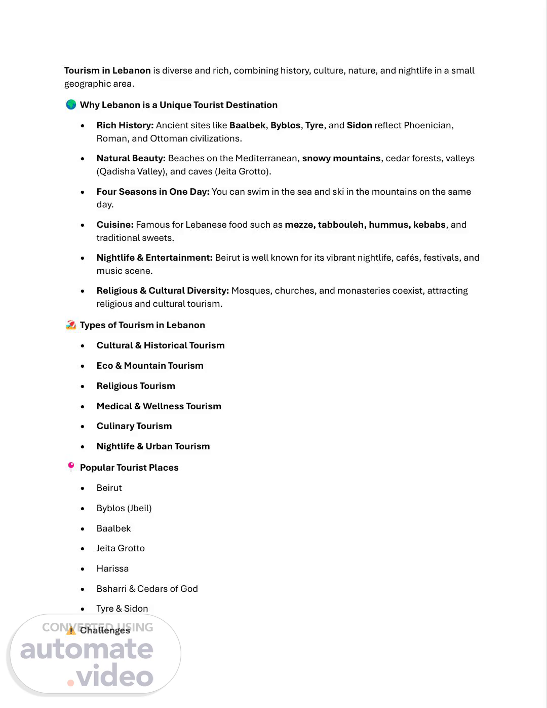 [Virtual Presenter] Tourism in Lebanon is diverse and rich, combining history, culture, nature, and nightlife in a small geographic area. Why Lebanon is a Unique Tourist Destination Rich History: Ancient sites like Baalbek, Byblos, Tyre, and Sidon reflect Phoenician, Roman, and Ottoman civilizations. Natural Beauty: Beaches on the Mediterranean, snowy mountains, cedar forests, valleys (Qadisha Valley), and caves (Jeita Grotto). Four Seasons in One Day: You can swim in the sea and ski in the mountains on the same day. Cuisine: Famous for Lebanese food such as mezze, tabbouleh, hummus, kebabs, and traditional sweets. Nightlife & Entertainment: Beirut is well known for its vibrant nightlife, cafés, festivals, and music scene. Religious & Cultural Diversity: Mosques, churches, and monasteries coexist, attracting religious and cultural tourism. Types of Tourism in Lebanon Cultural & Historical Tourism Eco & Mountain Tourism Religious Tourism Medical & Wellness Tourism Culinary Tourism Nightlife & Urban Tourism Popular Tourist Places Beirut Byblos (Jbeil) Baalbek Jeita Grotto Harissa Bsharri & Cedars of God Tyre & Sidon Challenges.