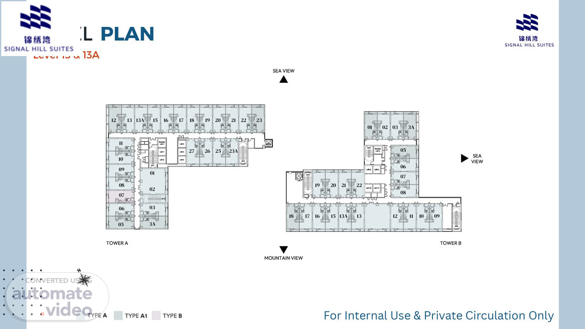 LEVEL PLAN Level 19 & 20 06 05 3A 03 TOWER A 13A 11 13 SEA VIEW 11 01 02 SIGNAL HILL SUITES VIEW 01 02 03 12 TYPE B TYPE C - Dual Key TYPE Cl - Dual Key TOWER B MOUNTAIN VIEW For Internal Use & Private Circulation Only.