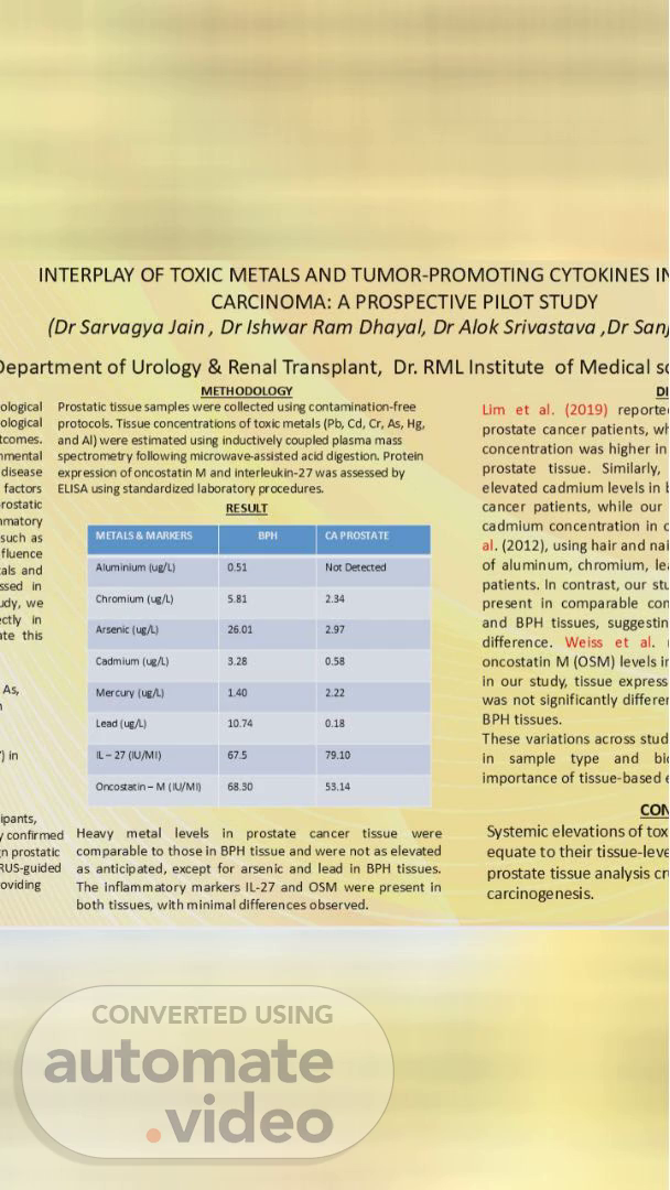 INTERPLAY OF TOXIC METALS AND TUMOR-PROMOTING CYTOKINES CARCINOMA: A PROSPECTIVE PILOT STUDY (Dr Sarvagya Jain , Dr Ishwar Ram Dhayal, Dr Alok Srivastava ,Dr Sanj )epartment of Urology & Renal Transplant, Dr. RML Institute of Medical sc -cal ological tcomes. disease factus rostatic •rnatory such as fLence als and in in ite this As, •ants, METH ODOLOGY Prostatic tisue samples conected ccntaminatim•free protocoÉ. Tissue concentrations of tokk metals (Pb, Cd, Cr, As, kg. and A1) were using inductively plasma mass spectronz•try following microwaveassisted aca digestion. Protein expressim of oncostatin M and interkukin-27 was assessai by ELISA LSing prxedures. RESULT AIL" (ug/L) Arsenic Cadm ium Lead ( IL -27 confirnEd n prostatic Ovid Heavy metal levels in prostate cancer tissue were comparable to those in BPH tissue and were not as elevated as anticipated, except for arsenic and lead in BPH tissues. The inflammatory markers IL-27 and OSM were preænt in both tissues, with minimal differences observed. Lim et al. (2019) reporte. prostate cancer patients, concentration was higher in prostate tissue. Similarly, elevated cadmium levels in cancer patients, while our cadmium concentration in c of aluminum, chromium, le, patients. In contrast, our sti present in comparable con and BPH tissues, suggestin difference. Weiss et al. oncostatin M (OSMI levels ir in our study, tissue express was not significantly differer BPH tissues. These variations across stud in sample type and bit importance of tissue-based Systemic elevations Of tox equate to their tissue-leve prostate tissue analysis carcinogenesis..