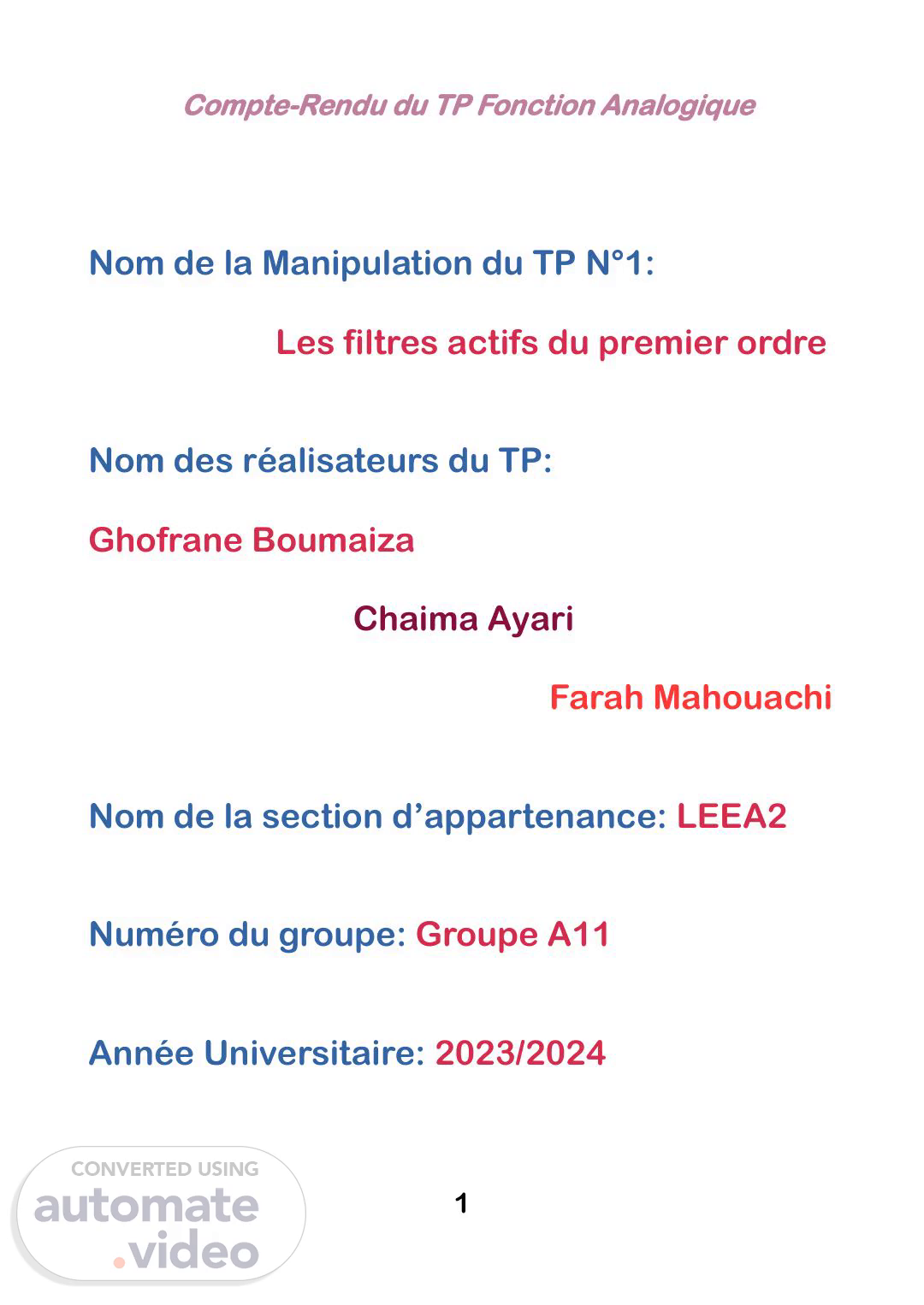 [Virtual Presenter] Compte-Rendu du TP Fonction Analogique Nom de la Manipulation du TP N°1: Les filtres actifs du premier ordre Nom des réalisateurs du TP: Ghofrane Boumaiza Chaima Ayari Farah Mahouachi Nom de la section d’appartenance: leea2 Numéro du groupe: Groupe A11 Année Universitaire: 2023/2024 1.
