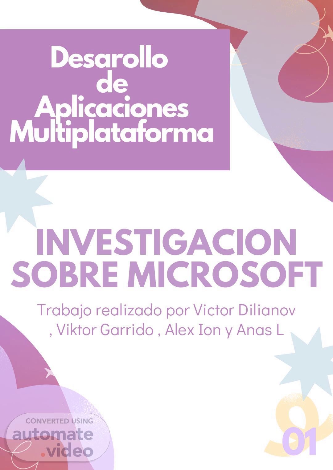 Trabajo realizado por Victor Dilianov , Viktor Garrido , Alex Ion y Anas L Desarollo de Aplicaciones Multiplataforma INVESTIGACION SOBRE MICROSOFT 01.