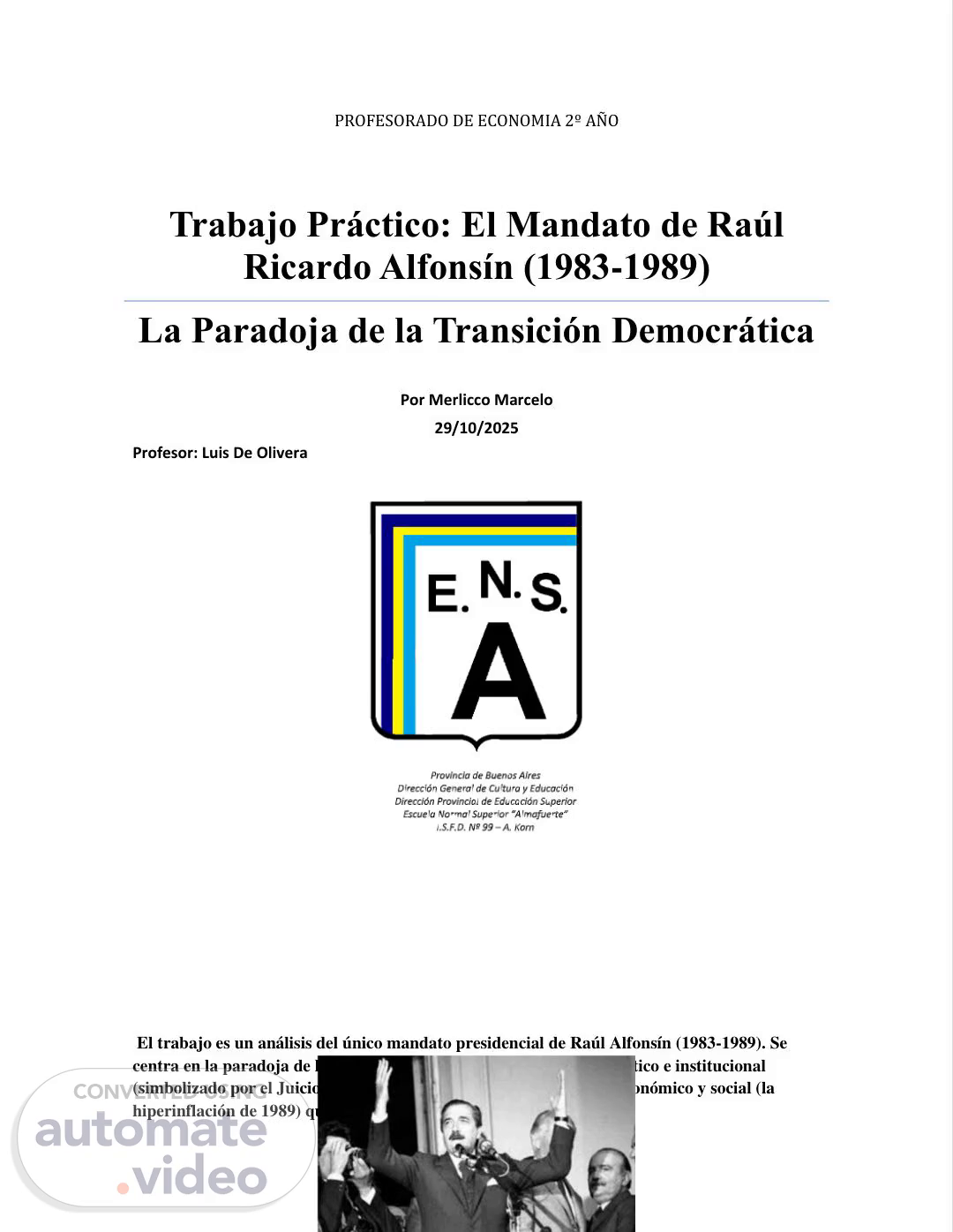 PROFESORADO DE ECONOMIA 2º AÑO Trabajo Práctico: El Mandato de Raúl Ricardo Alfonsín (1983-1989) La Paradoja de la Transición Democrática Por Merlicco Marcelo 29/10/2025 Profesor: Luis De Olivera El trabajo es un análisis del único mandato presidencial de Raúl Alfonsín (1983-1989). Se centra en la paradoja de la transición democrática: el gran éxito político e institucional (simbolizado por el Juicio a las Juntas) contrastado con el colapso económico y social (la hiperinflación de 1989) que forzó el traspaso anticipado del poder..