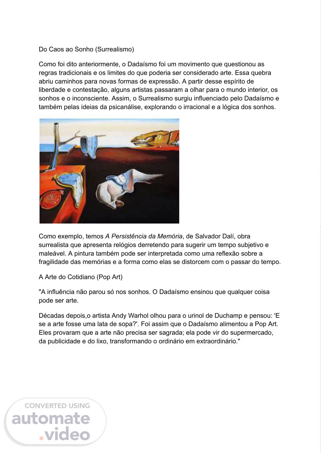 [Audio] The Dadaism movement was characterized by its rejection of traditional norms and conventions. This led to the creation of new forms de expressão, como o movimento de arte surrealista. O movimento surrealista explorou a irracionalidade e a lógica dos sonhos, muitas vezes usando técnicas não convencionais. Um exemplo é a pintura de Salvador Dalí, "A persistência da memória", que representa relógios derretendo para sugerir um tempo subjetivo e maleável. De forma semelhante, os dadaistas usaram humor e ironia para desafiar normas sociais. Eles também experimentaram com novas formas de arte, como colagem e montagem. O movimento enfatizou a espontaneidade e a improvisação, criando caminho para movimentos artísticos futuros, incluindo o movimento pop art. Hoje, podemos ver ressonâncias do dadaísmo na cultura contemporânea, desde memes de internet até remixagens digitais. Muitos pessoas criam sem medo de erros, improvisação ou ilogicidade, refletindo o espírito dadaísta de experimentação e rebeldia..