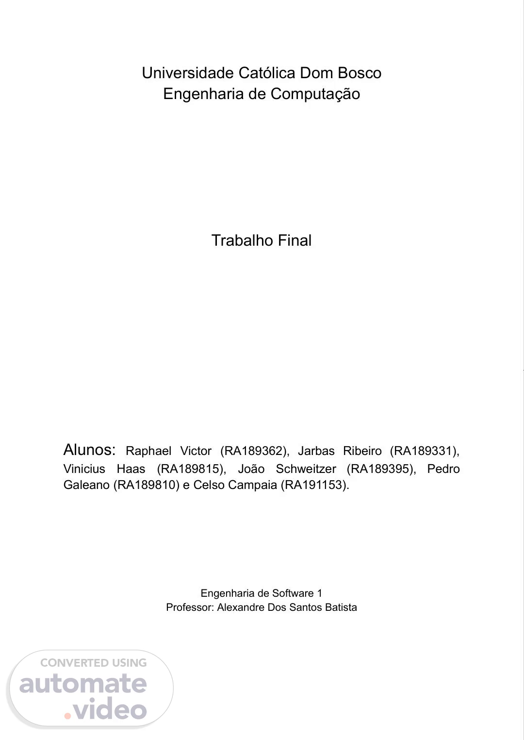 Universidade Católica Dom Bosco Engenharia de Computação Trabalho Final Alunos: Raphael Victor (RA189362), Jarbas Ribeiro (RA189331), Vinicius Haas (RA189815), João Schweitzer (RA189395), Pedro Galeano (RA189810) e Celso Campaia (RA191153). Engenharia de Software 1 Professor: Alexandre Dos Santos Batista.