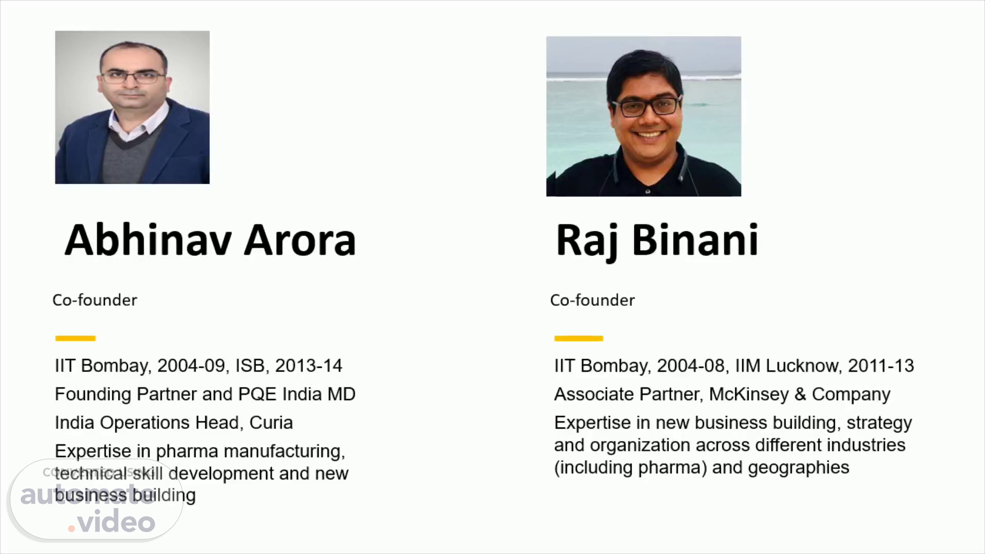 [Audio] Abhinav Arora. Co-founder. IIT Bombay, 2004-09, ISB, 2013-14 Founding Partner and PQE India MD India Operations Head, Curia Expertise in pharma manufacturing, technical skill development and new business building Raj Binani. Co-founder. IIT Bombay, 2004-08, IIM Lucknow, 2011-13 Associate Partner, McKinsey & Company Expertise in new business building, strategy and organization across different industries (including pharma) and geographies.