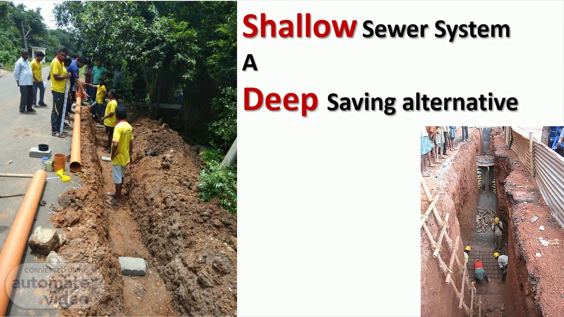 [Audio] Welcome to the narrated presentation on Shallow Sewer System. The conventional sewerage system, besides requiring huge capital investment, is often found to encounter unreasonable delay in its implementation. A group of professions at NCPE, with over two decades of experience in the field of water supply and sewerage, have undertaken a pilot study in one sewerage zone of Nalgonda Municipality in Telangana in order to demonstrate that the shallow sewer system is cost effective, permits rapid implementation, causes least public nuisance and involves minimum road digging..