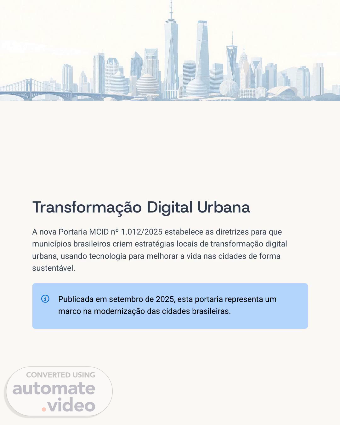 [Audio] Transformação Digital Urbana A nova Portaria MCID nº 1.012/2025 estabelece as diretrizes para que municípios brasileiros criem estratégias locais de transformação digital urbana, usando tecnologia para melhorar a vida nas cidades de forma sustentável. Publicada em setembro de 2025, esta portaria representa um marco na modernização das cidades brasileiras..