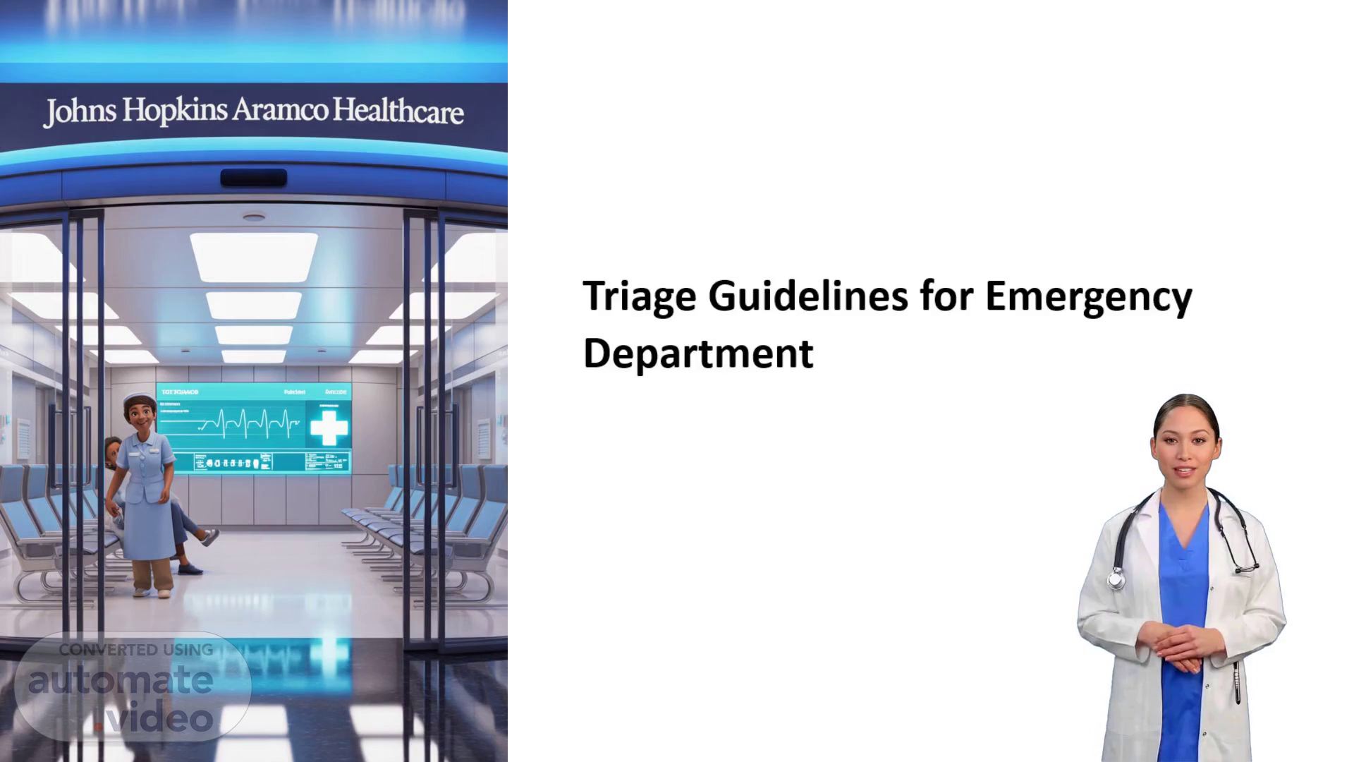 [Virtual Presenter] Today, we will be discussing the triage guidelines for emergency departments at Johns Hopkins Aramco Healthcare. These guidelines are crucial for prioritizing rapid and appropriate treatment for patients based on their medical urgency and resource requirements. In an emergency, time is of the essence. The triage guidelines have been carefully developed to ensure that patients receive timely and appropriate care. This is achieved through a comprehensive triage protocol that considers the patient's medical urgency and hospital resources. The primary goal of these guidelines is to provide the best possible care for patients in emergency situations. This is accomplished by quickly identifying and prioritizing those in greatest need of medical attention, while also considering the resources and capabilities of our hospital. By following these guidelines, we can effectively allocate our resources to provide optimal care for our patients. It is important for healthcare professionals to understand and accurately apply these guidelines in emergency situations. This not only ensures the best outcomes for patients, but also helps to reduce wait times and improve efficiency within the emergency department. In conclusion, the triage guidelines at Johns Hopkins Aramco Healthcare are essential for providing rapid and appropriate treatment for patients based on their individual needs. We are committed to upholding these guidelines and continuously improving them to ensure the highest level of care for our patients. Please continue to listen for the rest of our presentation on this topic..