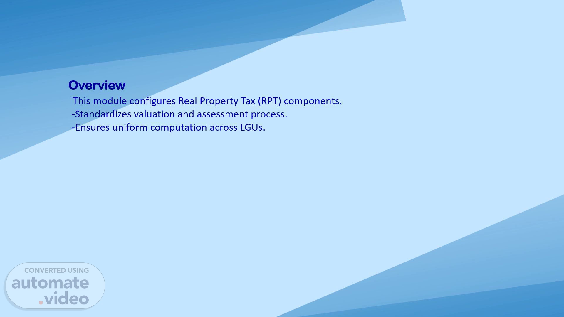 [Audio] Overview This module configures Real Property Tax (RPT) components. -Standardizes valuation and assessment process. -Ensures uniform computation across LGUs. Overview- This module configures Real Property Tax (RPT) components. -Standardizes valuation and assessment process. -Ensures uniform computation across LGUs..