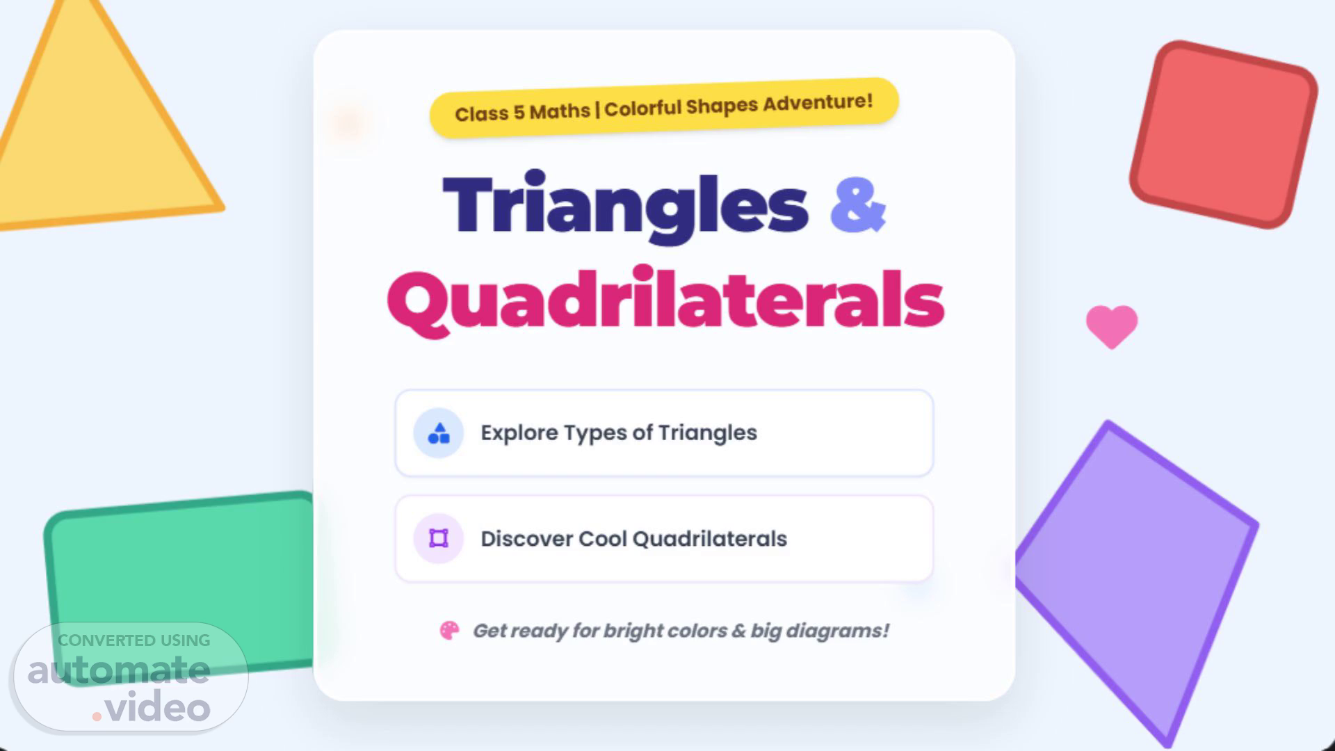 Class 5 Maths I Colorful Shapes Adventure! Triangles Quadrilaterals Explore Types of Triangles Discover Cool Quadrilaterals Get ready for bright colors & big diagrams!.