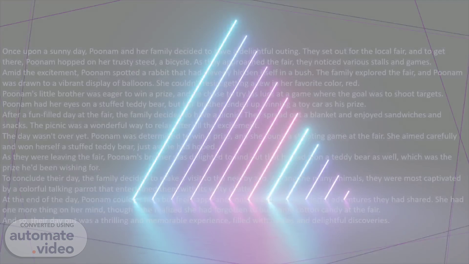 [Audio] Once upon a sunny day, Poonam and her family decided to have a delightful outing. They set out for the local fair, and to get there, Poonam hopped on her trusty steed, a bicycle. As they approached the fair, they noticed various stalls and games. Amid the excitement, Poonam spotted a rabbit that had cleverly hidden itself in a bush. The family explored the fair, and Poonam was drawn to a vibrant display of balloons. She couldn't resist getting a few in her favorite color, red. Poonam's little brother was eager to win a prize, and he chose to try his luck at a game where the goal was to shoot targets. Poonam had her eyes on a stuffed teddy bear, but her brother ended up winning a toy car as his prize. After a fun-filled day at the fair, the family decided to have a picnic. They spread out a blanket and enjoyed sandwiches and snacks. The picnic was a wonderful way to relax after all the excitement. The day wasn't over yet. Poonam was determined to win a prize, and she found a shooting game at the fair. She aimed carefully and won herself a stuffed teddy bear, just as she had hoped. As they were leaving the fair, Poonam's brother was delighted to find out that he had won a teddy bear as well, which was the prize he'd been wishing for. To conclude their day, the family decided to make a visit to the nearby zoo. Among the many animals, they were most captivated by a colorful talking parrot that entertained them with its witty chatter. At the end of the day, Poonam couldn't help but feel happy and content with the wonderful adventures they had shared. She had one more thing on her mind, though - she realized she had forgotten to buy some cotton candy at the fair. And so, their day out was a thrilling and memorable experience, filled with riddles and delightful discoveries..