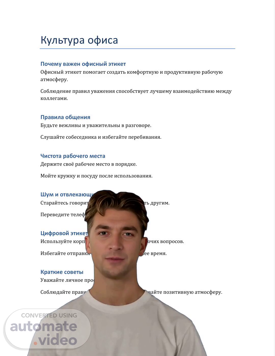 [Virtual Presenter] Добрый день. Вашему вниманию предлагается первый слайд презентации офисного этикета. Офисный этикет - это набор правил, которые помогают создать комфортную и продуктивную рабочую атмосферу. Соблюдение этих правил способствует улучшению взаимодействия между коллегами. В разделе офисного этикета нам предстоит узнать о правилах общения, включая вежливость и уважение к собеседникам. Для поддержания порядка на рабочем месте, необходимо следить за чистотой и порядком, а также моментально убирать за собой использованную посуду. Чтобы не отвлекать коллег, при общении старайтесь говорить тихо и переключите телефон в беззвучный режим. Цифровой этикет тоже является важной частью офисного этикета, поэтому не забывайте использовать корпоративную почту для рабочих вопросов и избегайте отправки сообщений в нерабочее время. Наконец, мы рассмотрим несколько кратких советов о том, как уважать личное пространство коллег и поддерживать позитивную атмосферу в компании. Пожалуйста, следуйте правилам компании и помните, что соблюдение офисного этикета важно для эффективной работы коллектива. Спасибо за внимание..