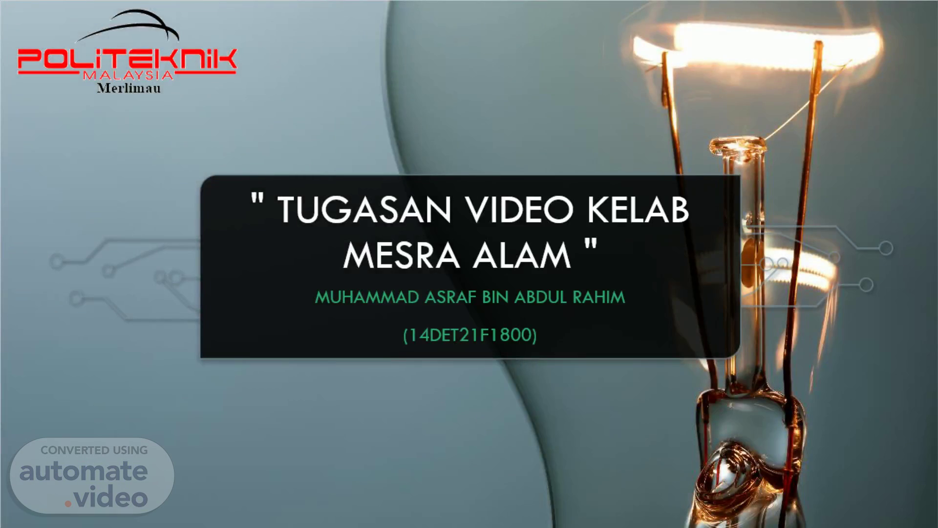 Lightbulb. " Tugasan Video Kelab Mesra Alam ". MUHAMMAD ASRAF BIN ABDUL RAHIM (14DET21F1800).