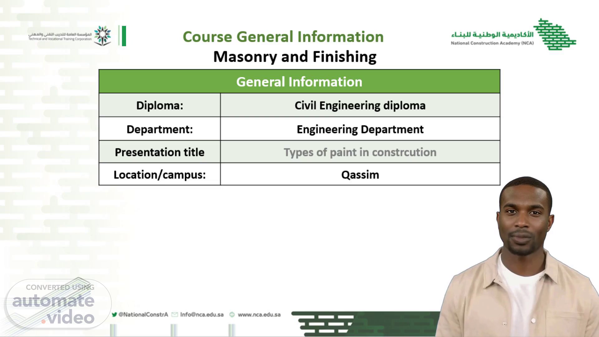 [Virtual Presenter] We are pleased to offer our Diploma Program in Civil Engineering. Our program is specifically designed to equip students with the knowledge and skills required to succeed in the civil engineering sector. Our presentation today will concentrate on the topic of paint in construction. We will explore the various categories of paint, their characteristics, and how they are utilized in masonry and finishing. We will present this information in a clear and easy-to-compare tabular format. Our presentation will occur on the Qassim campus. Please refer to the location/campus portion of the table for additional details. We anticipate that this presentation will be both informative and advantageous to you. If you have any questions, please do not hesitate to inquire..