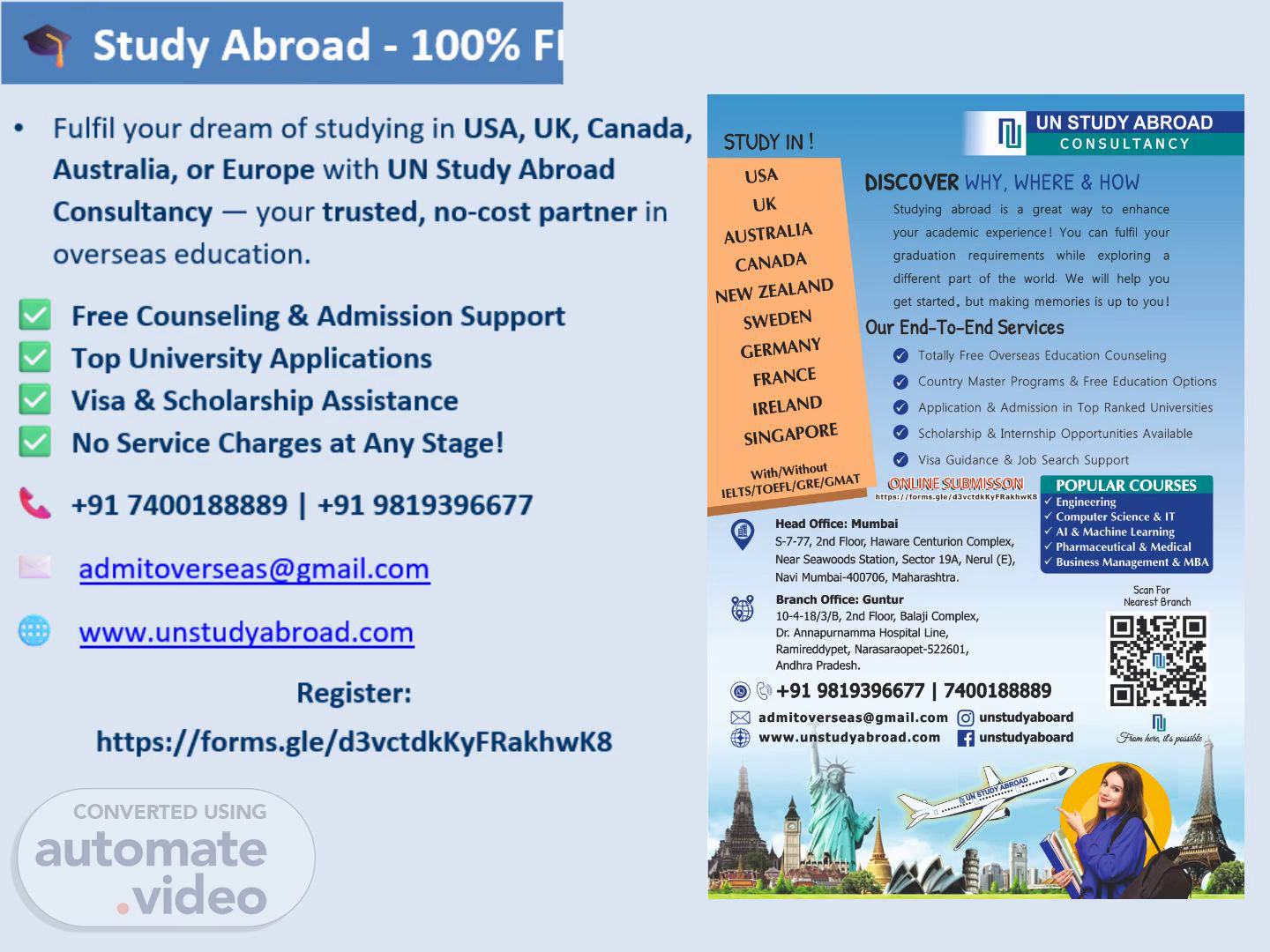 Fulfil your dream of studying in USA, UK, Canada, Australia, or Europe with UN Study Abroad Consultancy — your trusted, no-cost partner in overseas education. ✅ Free Counseling & Admission Support ✅ Top University Applications ✅ Visa & Scholarship Assistance ✅ No Service Charges at Any Stage! 📞 +91 7400188889 | +91 9819396677 ✉️ [email protected] 🌐 www.unstudyabroad.com Register: https://forms.gle/d3vctdkKyFRakhwK8.
