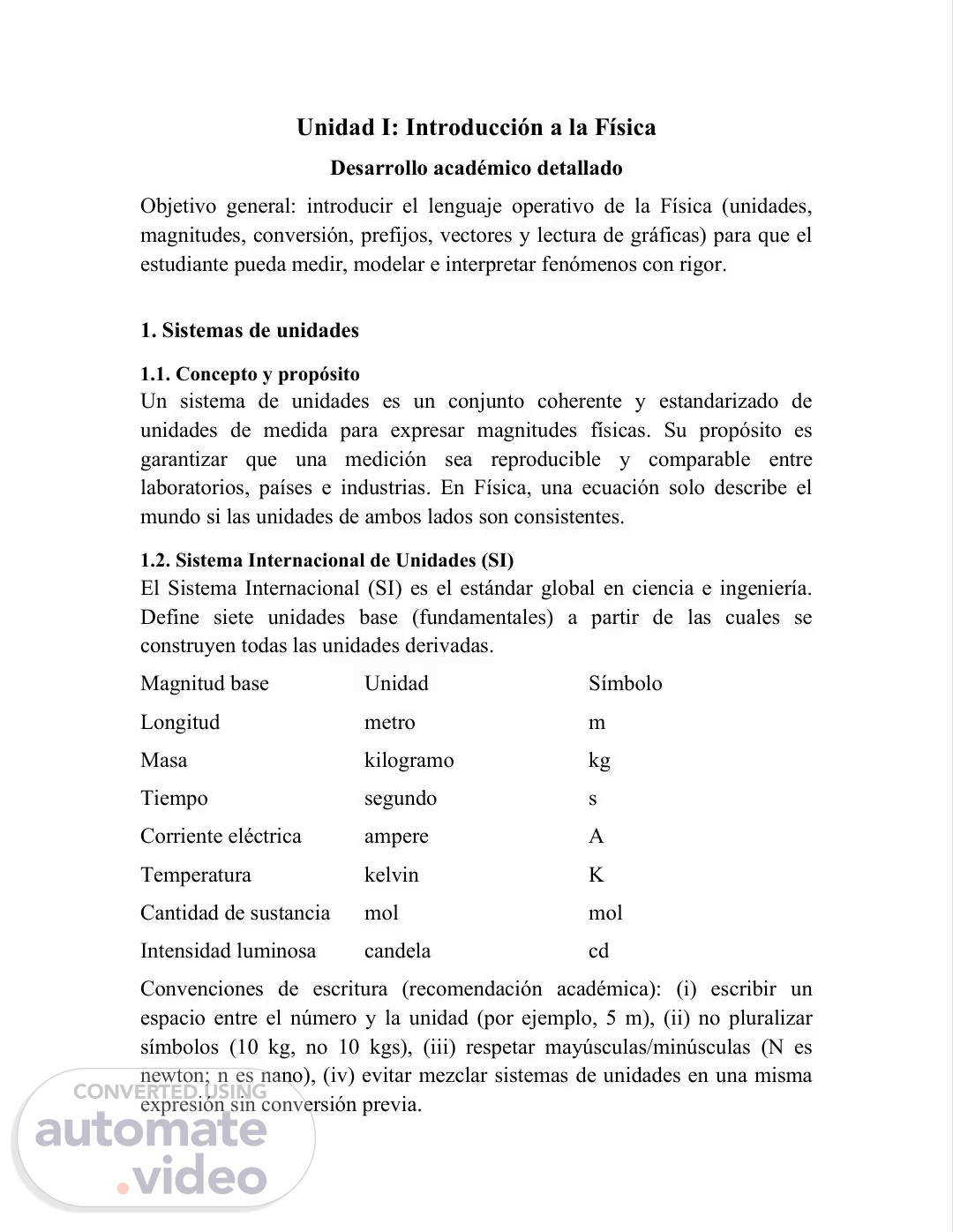 [Audio] Unidad I: Introducción a la Física Desarrollo académico detallado Objetivo general: introducir el lenguaje operativo de la Física (unidades, magnitudes, conversión, prefijos, vectores y lectura de gráficas) para que el estudiante pueda medir, modelar e interpretar fenómenos con rigor. 1. Sistemas de unidades 1.1. Concepto y propósito Un sistema de unidades es un conjunto coherente y estandarizado de unidades de medida para expresar magnitudes físicas. Su propósito es garantizar que una medición sea reproducible y comparable entre laboratorios, países e industrias. En Física, una ecuación solo describe el mundo si las unidades de ambos lados son consistentes. 1.2. Sistema Internacional de Unidades (SI) El Sistema Internacional (SI) es el estándar global en ciencia e ingeniería. Define siete unidades base (fundamentales) a partir de las cuales se construyen todas las unidades derivadas. Magnitud base Unidad Símbolo Longitud metro m Masa kilogramo kg Tiempo segundo s Corriente eléctrica ampere A Temperatura kelvin K Cantidad de sustancia mol mol Intensidad luminosa candela cd Convenciones de escritura (recomendación académica): (i) escribir un espacio entre el número y la unidad (por ejemplo, 5 m), (ii) no pluralizar símbolos (10 kg, no 10 kgs), (iii) respetar mayúsculas/minúsculas (N es newton; n es nano), (iv) evitar mezclar sistemas de unidades en una misma expresión sin conversión previa..
