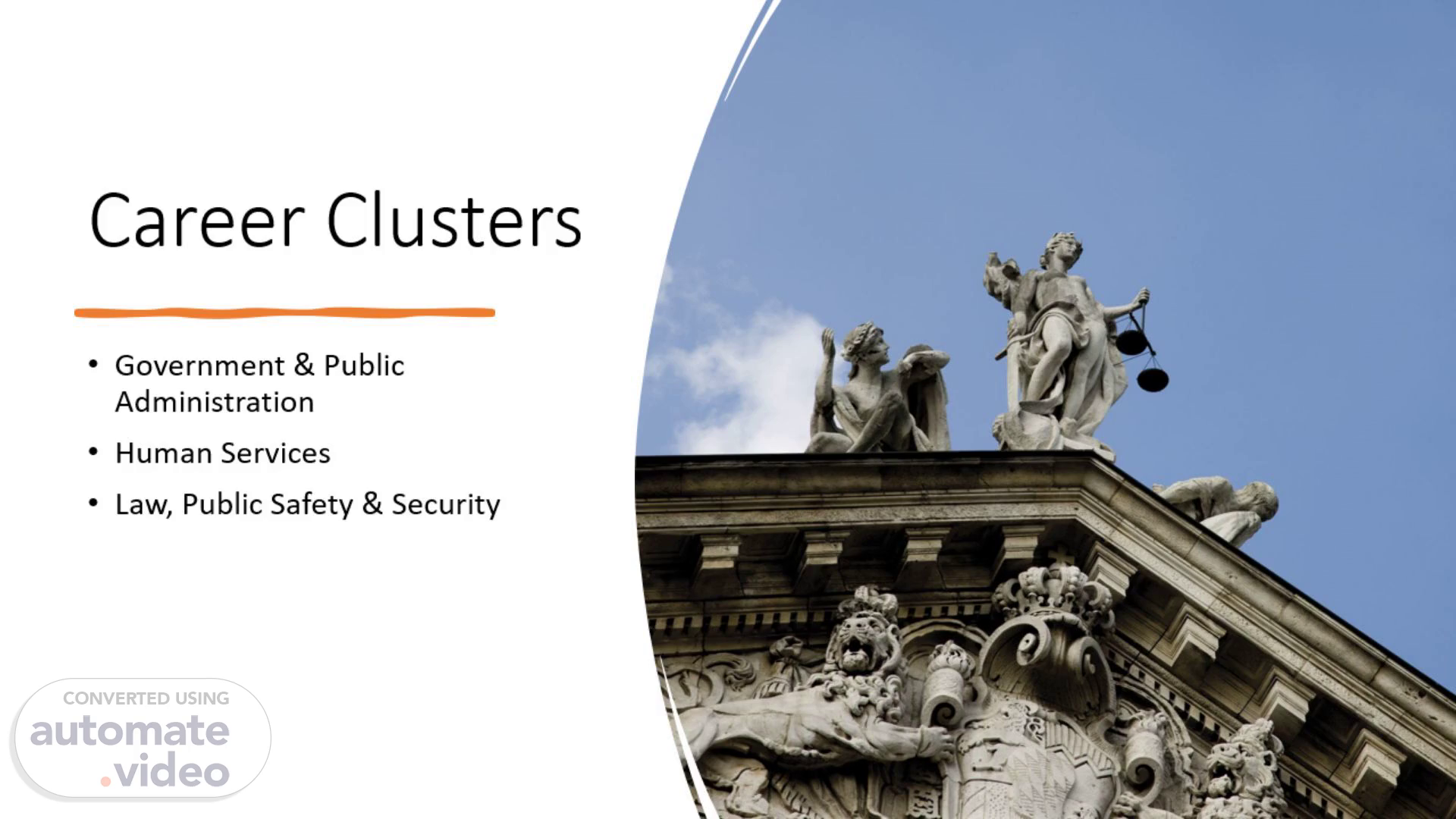 [Audio] [break]% Career Clusters Government & Public Administration Human Services Law, Public Safety & Security.