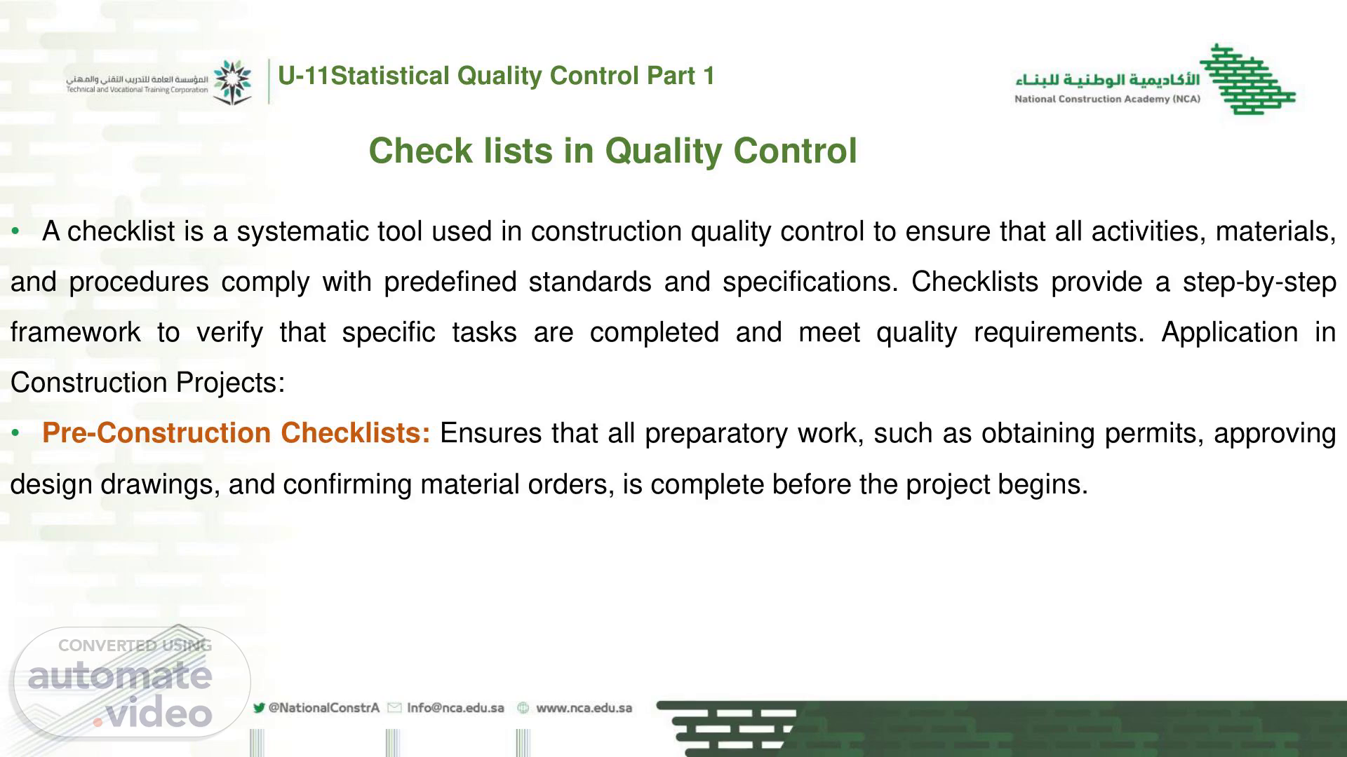 [Audio] U-11Statistical Quality Control Part 1 Check lists in Quality Control A checklist is a systematic tool used in construction quality control to ensure that all activities, materials, and procedures comply with predefined standards and specifications. Checklists provide a step-by-step framework to verify that specific tasks are completed and meet quality requirements. Application in Construction Projects: Pre-Construction Checklists: Ensures that all preparatory work, such as obtaining permits, approving design drawings, and confirming material orders, is complete before the project begins..