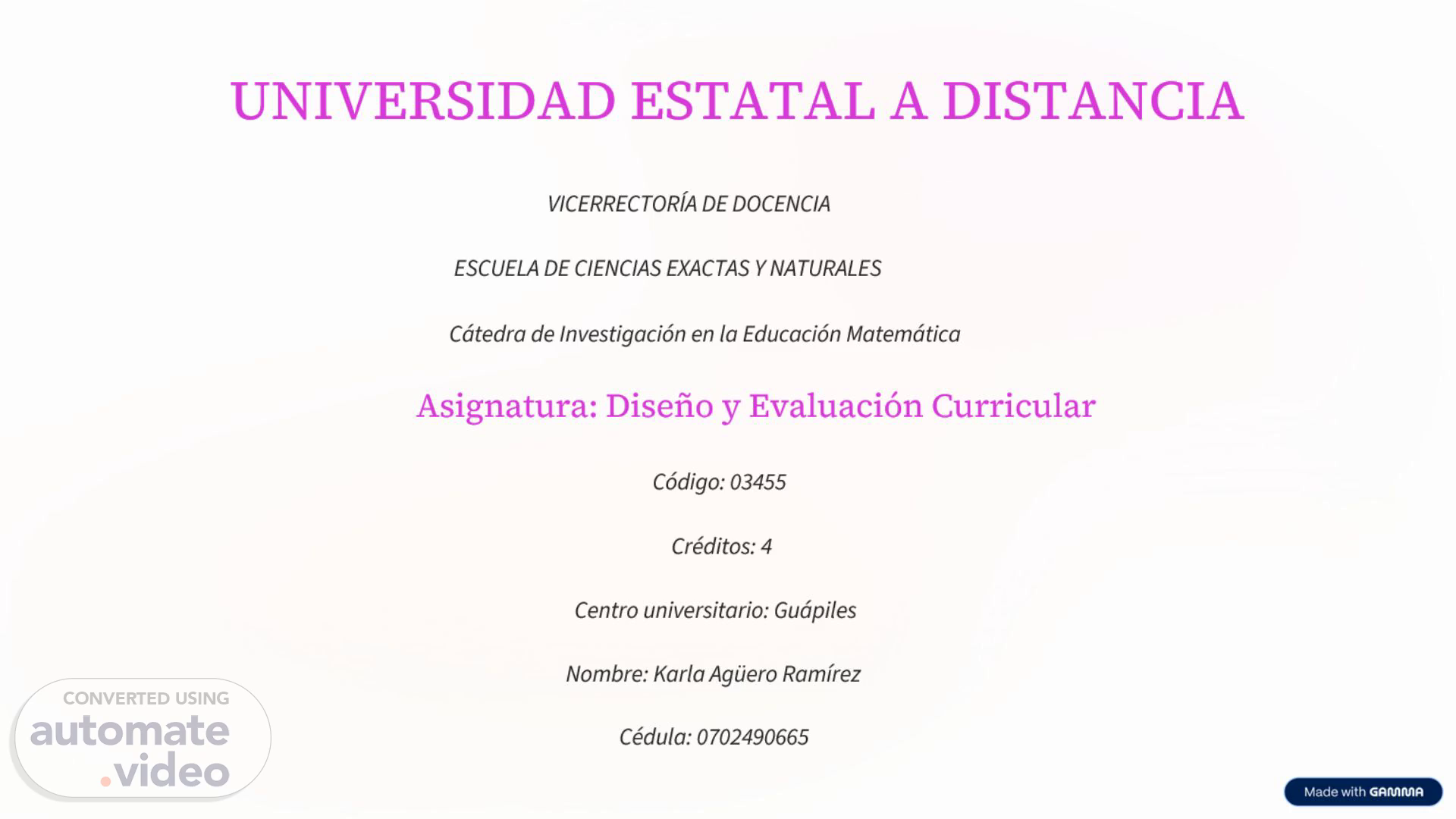[Audio] UNIVERSIDAD ESTATAL A DISTANCIA VICERRECTORÍA DE DOCENCIA ESCUELA DE CIENCIAS EXACTAS Y NATURALES Cátedra de Investigación en la Educación Matemática Asignatura: Diseño y Evaluación Curricular Código: 03455 Créditos: 4 Centro universitario: Guápiles Nombre: Karla Agüero Ramírez Cédula: 0702490665.